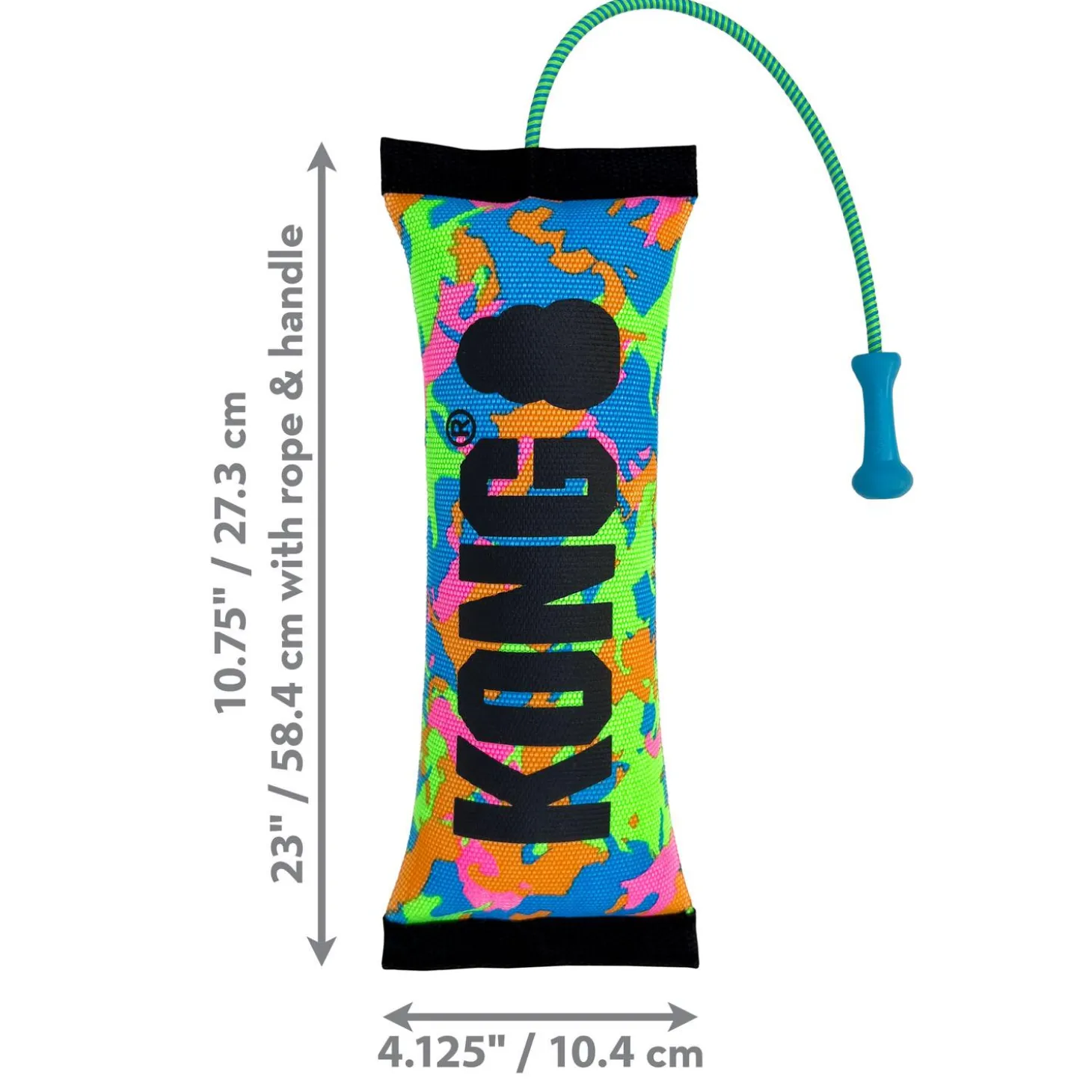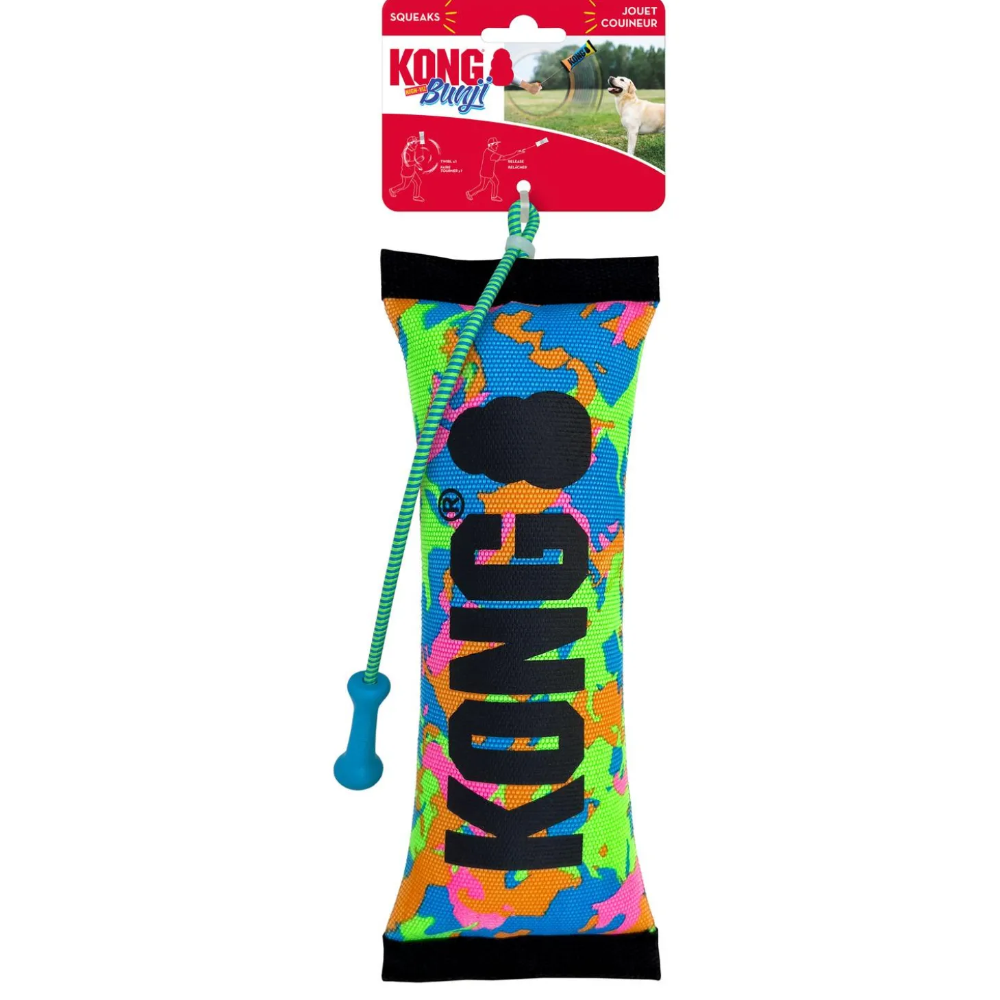 KONG Bunji High-Viz Bumper Assorted Colours Dog Toy is specially designed with bright colours and contrasting patterns for high visibility in various environments, weather, and terrain. Heavy duty firehose material, webbing-sealed edges, and bungee rope makes this toy perfect for energetic fetch-and-retrieve play. The squeaker engages natural instincts during play sessions, while the ergonomic rope & handle design effortlessly launches at long distances, saving your shoulder from burnout!