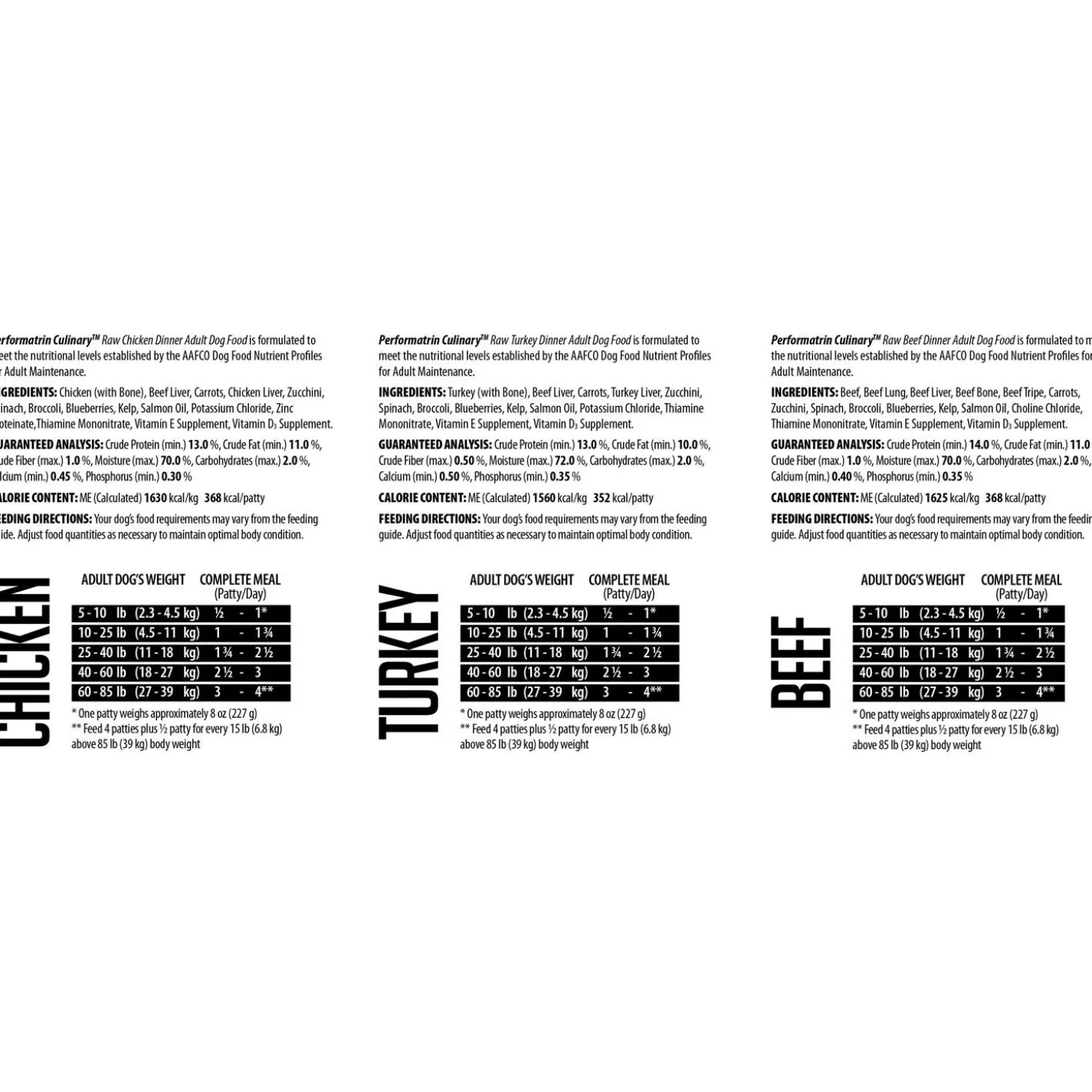 Performatrin Culinary Butcher’s Select Raw Chicken, Turkey & Beef Dinners Adult Dog Food is a great alternative if you are looking for less processed food. It is made with high quality muscle and organ meats, and all the vitamins, minerals, and other nutrients that a dog needs to thrive. With freshly prepared foods, containing 90% meat, bones and organs, and natural antioxidants from Superfoods like zucchini and blueberries, your dog will love these delicious mouth-watering recipes. All dinners are complete and balanced. The chicken & turkey dinners are a great mix of protein and beneficial fats suitable for all dogs. The beef dinner has a high protein content, making it ideal for high energy dogs. No measuring or weighing required. The easy to peel and serve patties take away the ick factor of raw meat.