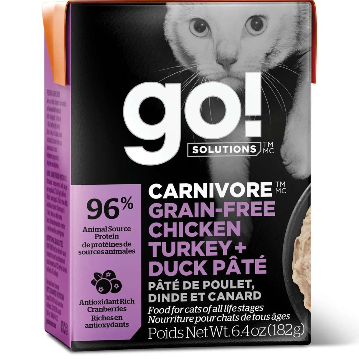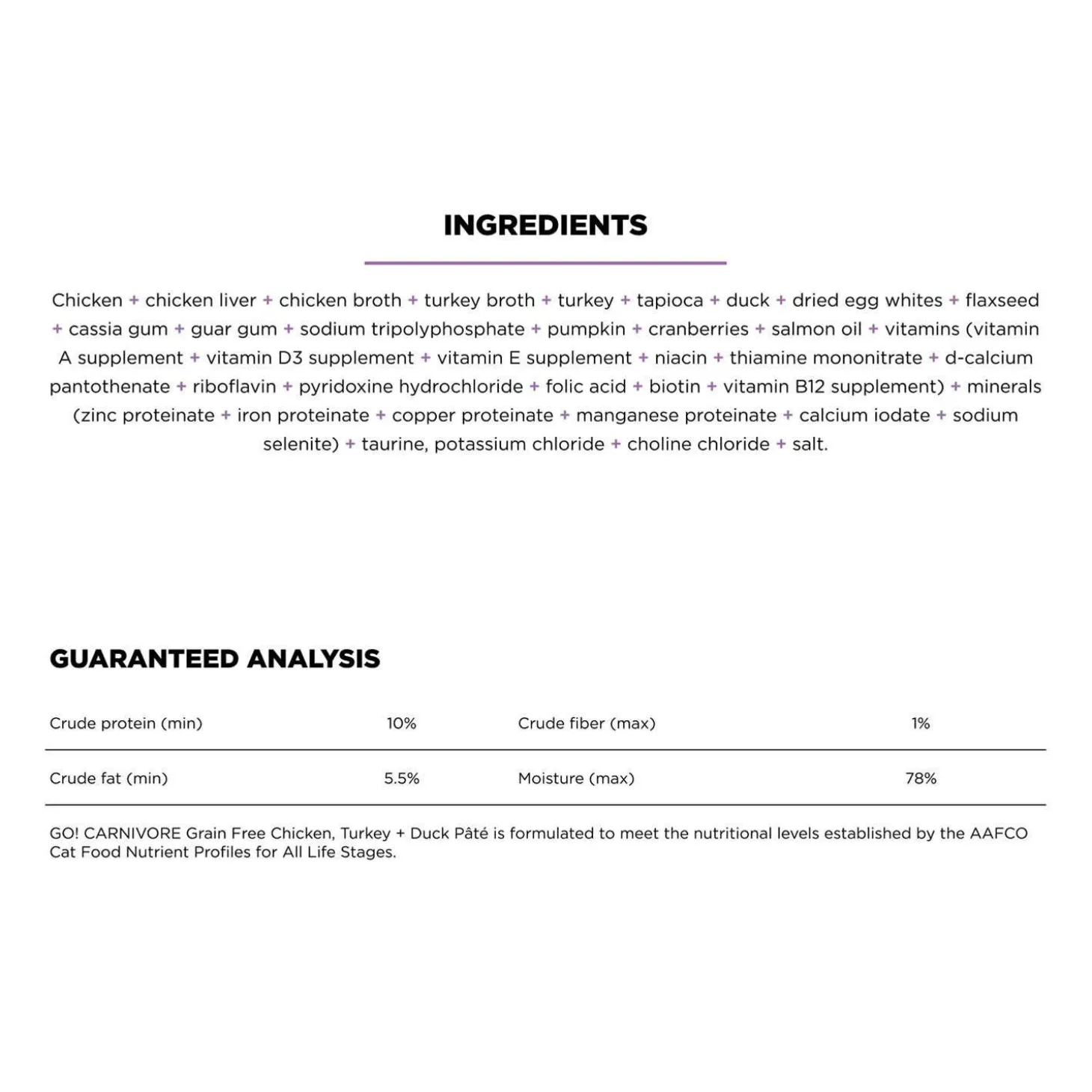 Go! Solutions Carnivore Grain Free Chicken, Turkey + Duck Pate Recipe Cat Food is a protein-packed meal bursting with real meat to support their strong and lean muscles. Formulated in Ontario, Canada, this tasty wet cat food not only satisfies their taste buds but also provides complete and balanced nutrition for cats of all ages.