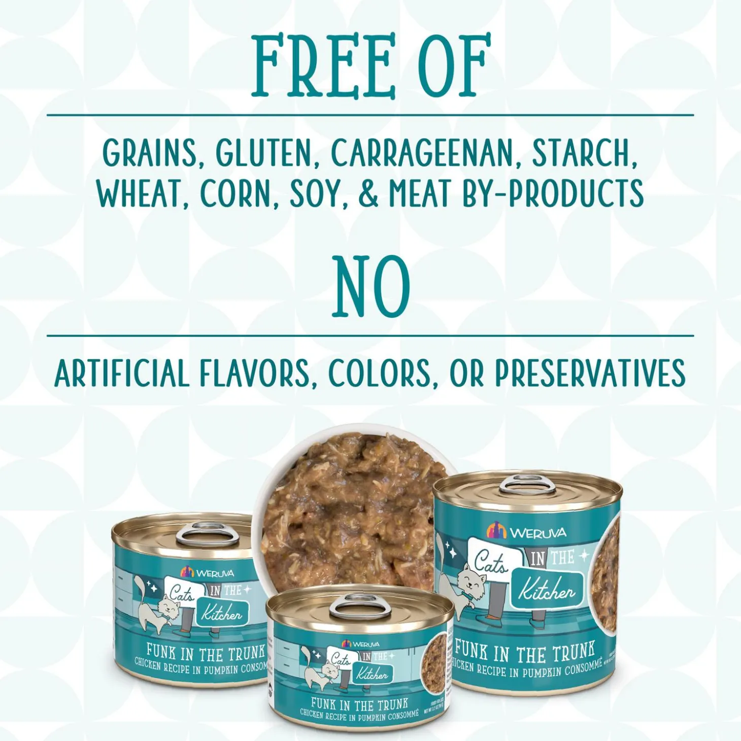 Weruva Cats in the Kitchen Funk in the Trunk Chicken Recipe in Pumpkin Adult Cat Food brings the funk to mealtime with a recipe your cat will crave! Featuring boneless, cage-free chicken and chunks of pumpkin in a flavourful au jus, it’s high in protein, low in carbs, starch-free, and crafted to fuel your kitchen carnivore’s natural cravings.