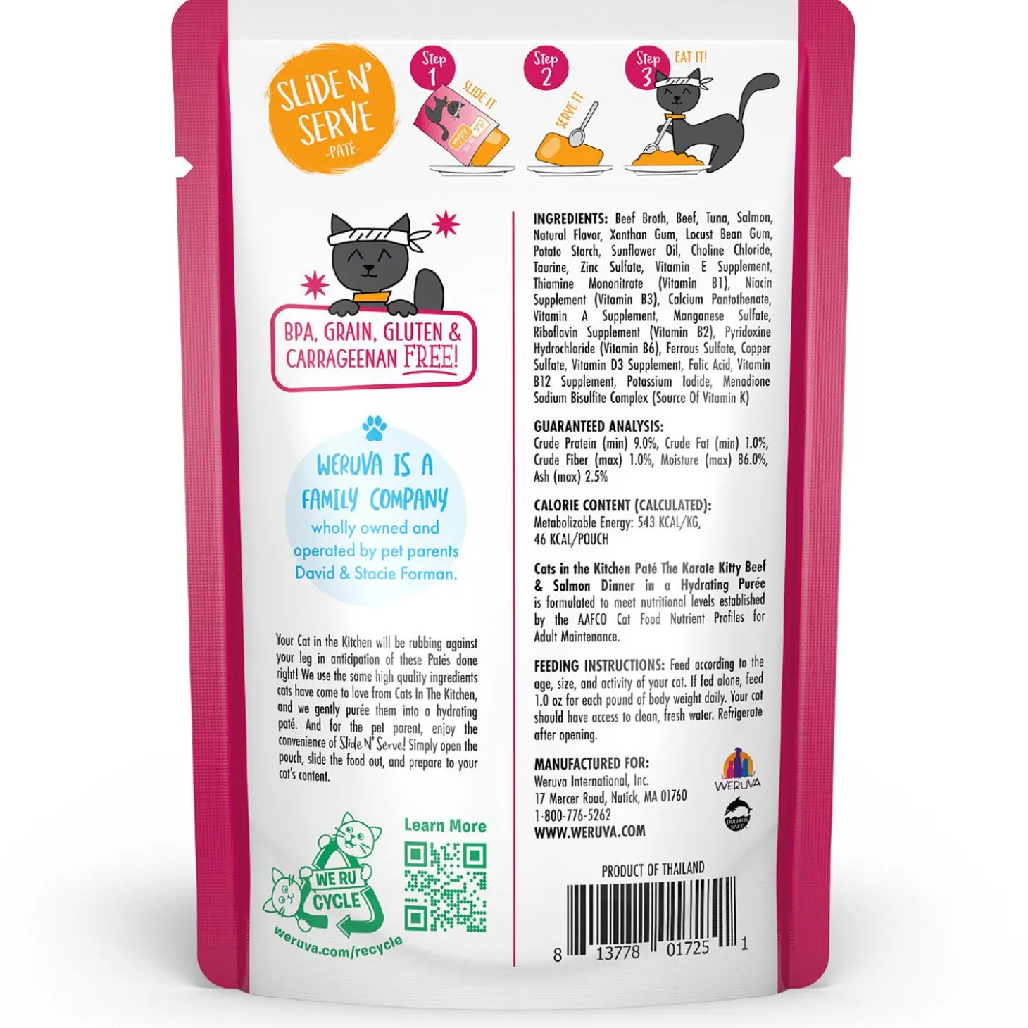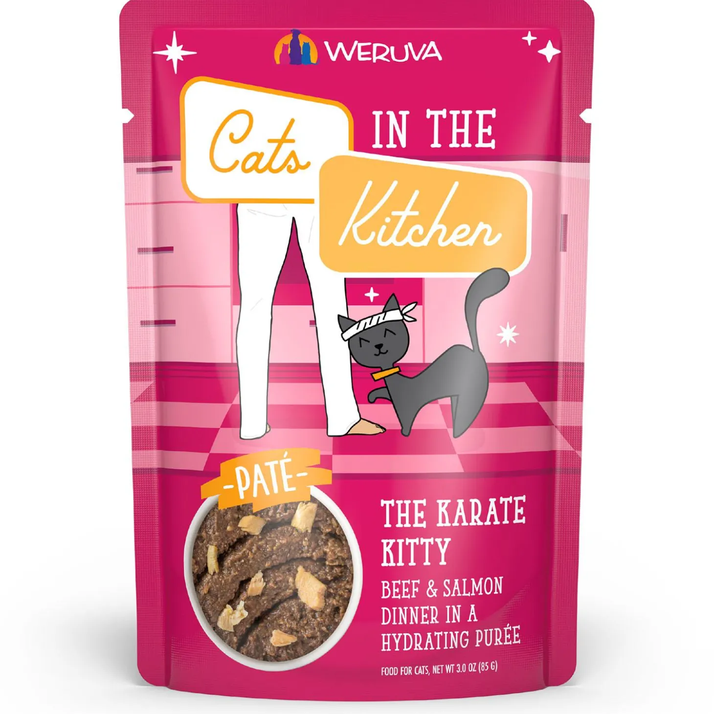 Weruva Cats in the Kitchen The Karate Kitty Beef & Salmon Dinner Adult Cat Food is crafted with premium, bone-free proteins like grass-fed beef and wild-caught salmon, this smooth and creamy pate in a convenient Slide N’ Serve pouch is sure to please your finicky kitchen carnivore. Your cat will kick hunger to the curb with this flavor-packed recipe.