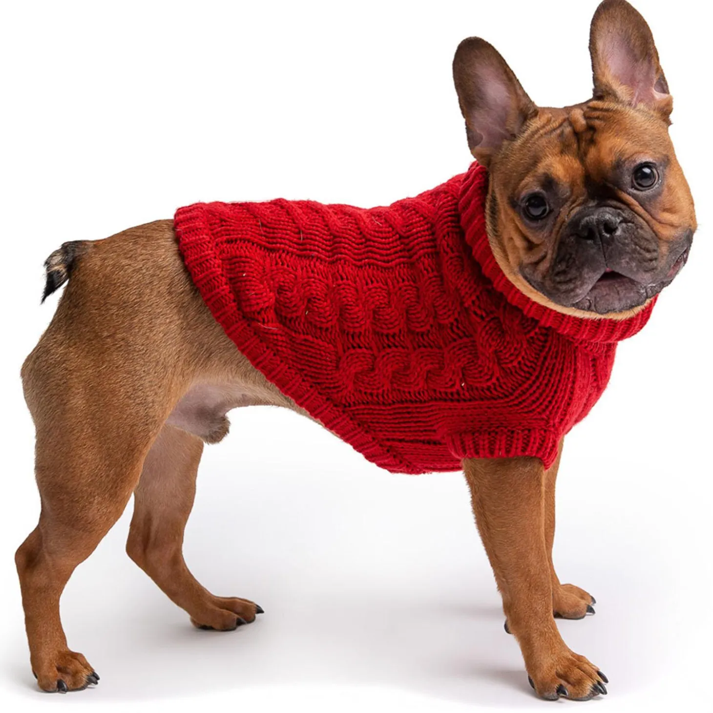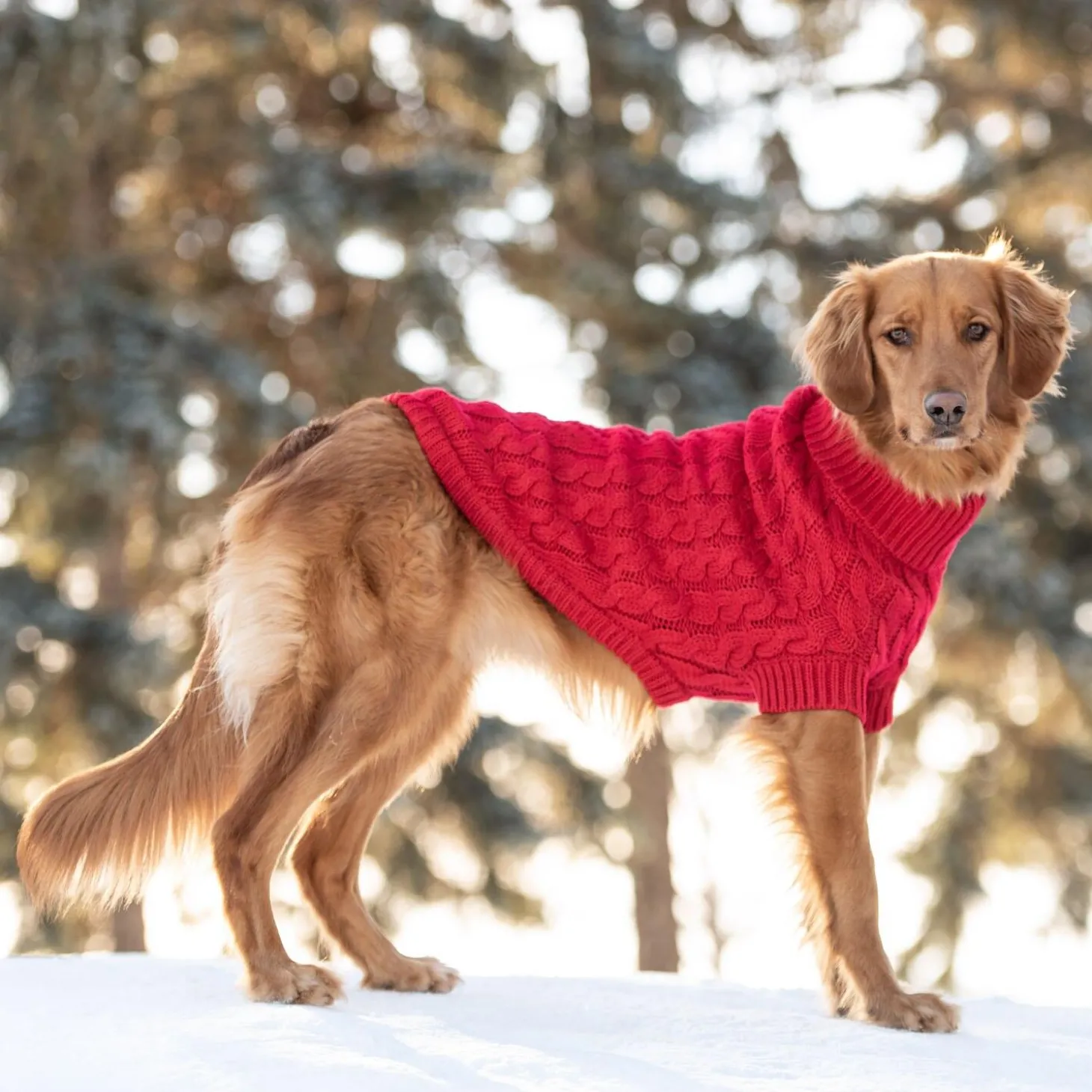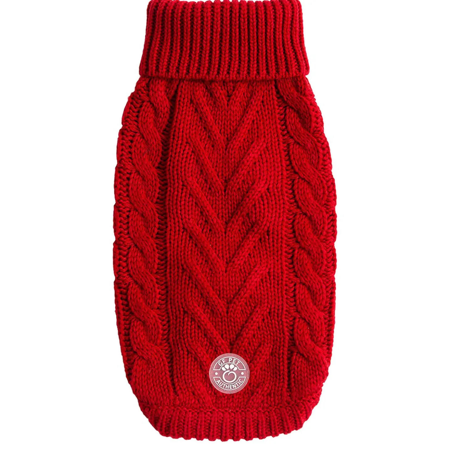 GF Pet Chalet Red Sweater is chunky and snuggly soft. The high turtleneck, ribbed arm holes and sculpted body shape make for a super comfy fit for both boy and girl doggies. A timeless and luxurious cable knit classic!