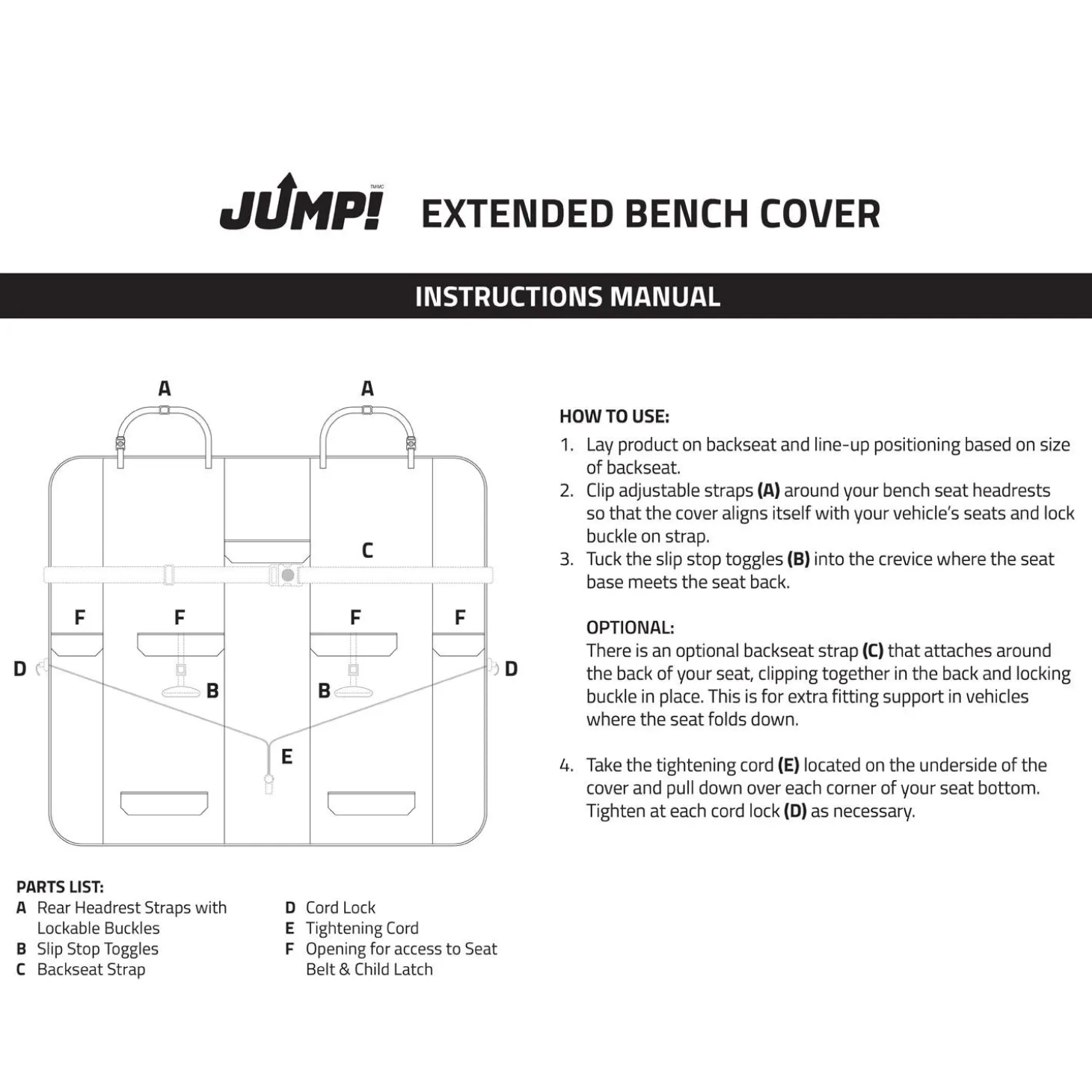 JUMP! Charcoal Grey Extended Bench Cover ensures your seats are protected so bring your pet along! Pet hair & muddy paws don’t stand a chance against the JUMP! Extended Bench Cover. Protect your vehicle from muddy adventures while keeping your pet secure with this durable, water resistant barrier between your dog and vehicle. Lockable buckles prevent unwanted release of bench from car.