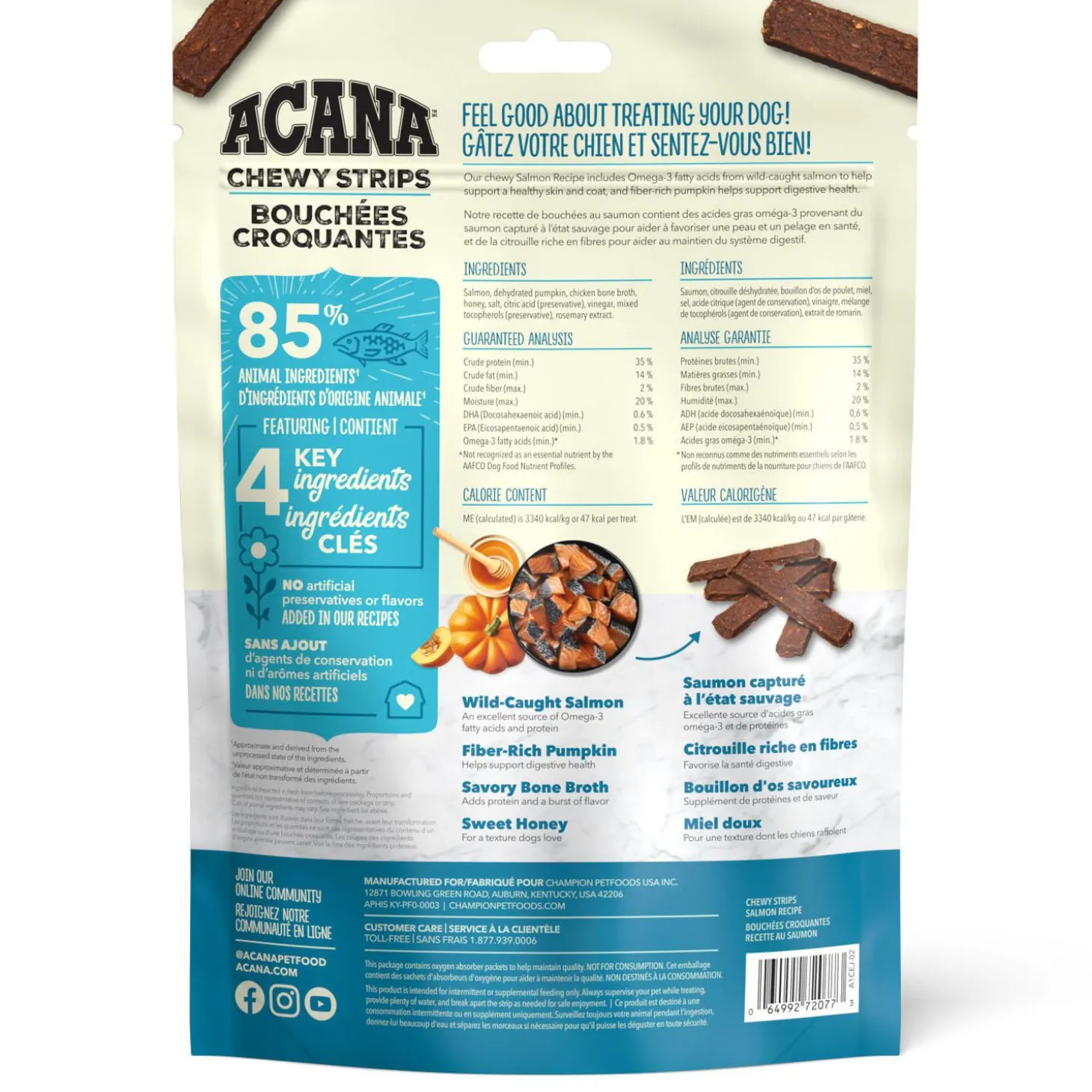 ACANA Chewy Strips Skin Coat & Digestive Support Salmon Recipe Dog Treats will delight your dog with their savoury flavour! crafted with just 5 key ingredients, including delicious wild-caught salmon and fibre-rich pumpkin, you can feel good about treating your dog. Every strip also helps support your dogs skin and coat with Omega-3 fatty acids from wild-caught salmon, and digestive health from fibre-rich pumpkin. Bone broth adds a burst of flavour, and sweet honey gives Chewy Strips a texture dogs love. Its the perfect snack for moments you want to treat your dog while also helping to support their wellbeing!