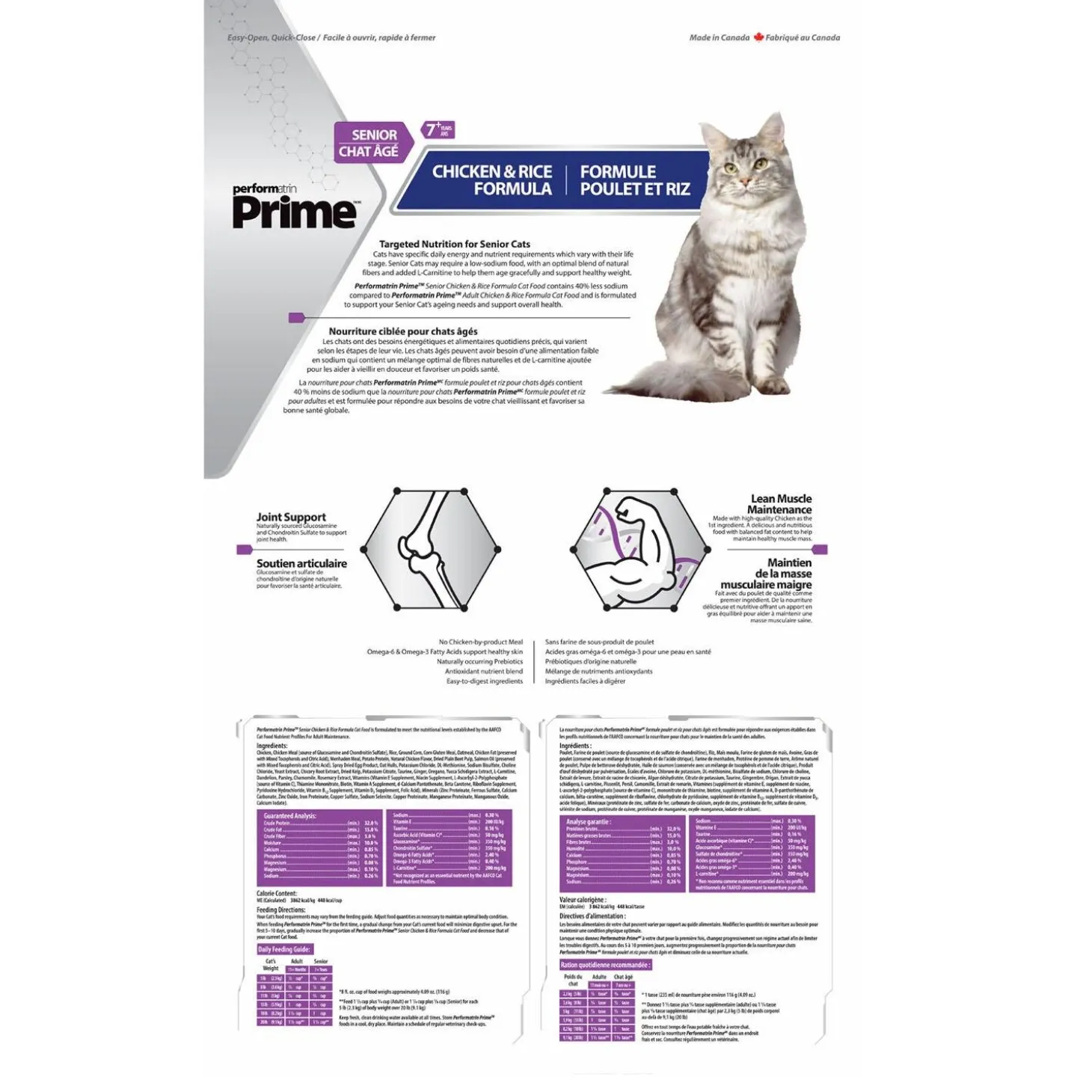 Performatrin Prime Chicken & Rice Formula Senior Cat Food is designed for specific daily energy and nutrient requirements unique to senior cats. Senior cats may require a low-sodium food with extra joint support, as well as an optimal blend of antioxidants, and added L-Carnitine to help them age gracefully and support healthy weight. This food contains 40% less sodium compared to Performatrin Prime Adult Chicken & Rice Formula Adult Cat Food and is formulated to support your senior cat’s ageing needs and support overall health.