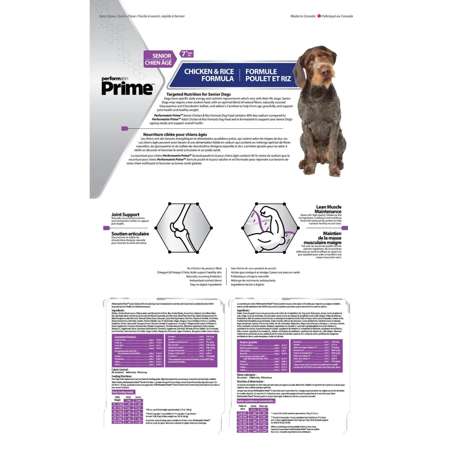 Performatrin Prime Chicken & Rice Formula Senior Dog Food is designed for specific daily energy and nutrient requirements unique to senior dogs. Senior dogs may require a low-sodium food with extra joint support, as well as an optimal blend of antioxidants, and added L-Carnitine to help them age gracefully and support healthy weight. This food contains 40% less sodium compared to Performatrin Prime Adult Chicken & Rice Formula Dog Food and is formulated to support your senior dog’s ageing needs and support overall health.