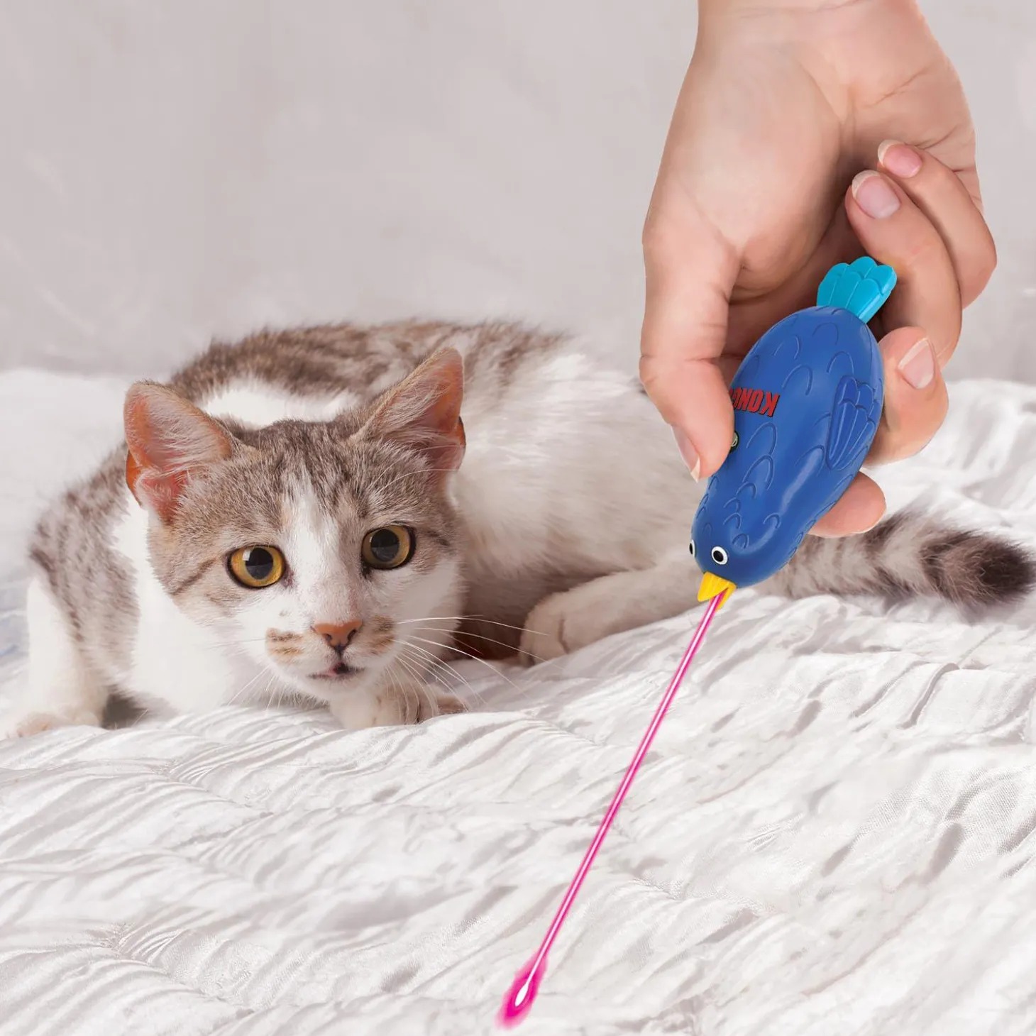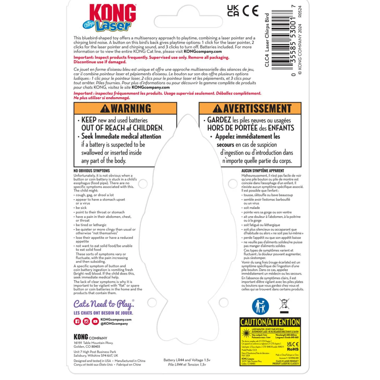 KONG Chirps Laser Bird Cat Toy has landed! This bluebird-shaped toy is unique, offering a multisensory approach to playtime with the combination of a laser pointer and chirping bird noise. A button on this bird’s back gives playtime options: 1 click for the laser pointer, 2 clicks for the laser pointer and chirping sound, and 3 clicks to turn off. Now your kitty will hear an intriguing chirping bird noise while they chase the dot, giving them an exciting interactive playtime option with an added boost of healthy movement. Batteries included.