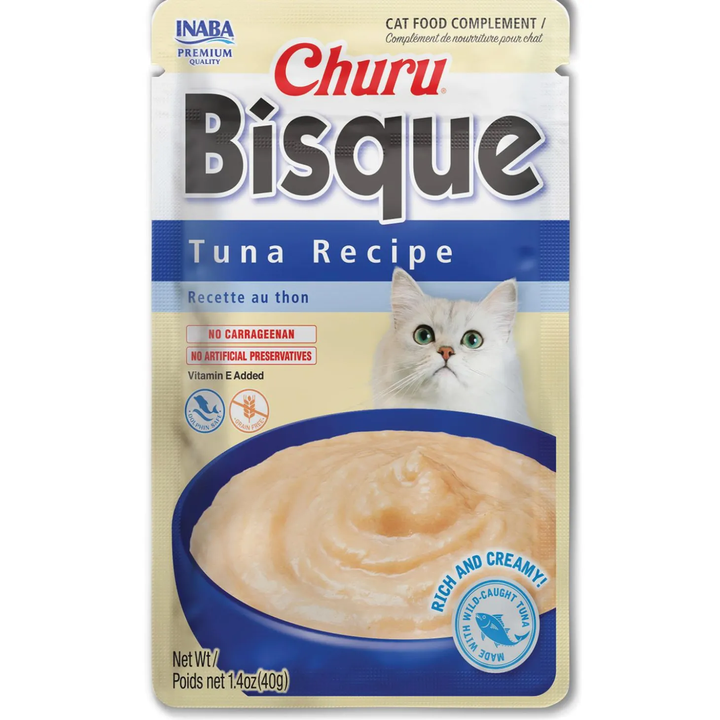 Inaba Churu Bisque Tuna Recipe Cat Food Topper is made from high-quality ingredients including wild-caught tuna. Each pouch contains a mouthwatering puree bisque that is both healthy and hydrating with 91% moisture and 16 calories per serving. It is also grain-free, preservative-free, carrageenan-free and free from artificial colours. It has added Vitamin E to help support your cat’s immune system, so these are a treat you can feel good about feeding your cat. Perfect for all ages-kitten to senior, simply tear open the pouch and pour out the delicious thick bisque. Use as a side dish, complement to a meal, wet/dry cat food topper or as a special treat, your kitties will thank you from the bottom of their paws.