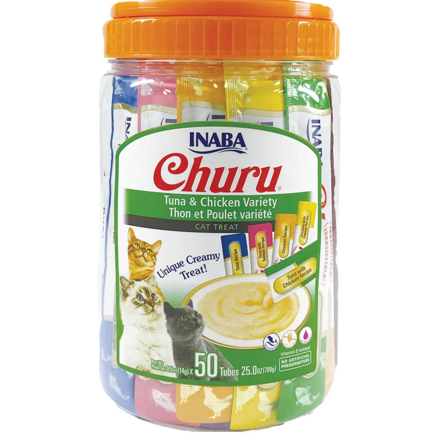 INABA Churu Tuna & Chicken Variety Pack Cat Treats is made from high-quality ingredients, including wild-caught tuna and farm-raised chicken. Since cats are not naturally drawn to water, INABA has made these a high-moisture, low calorie cat treat that your kitties will love. They’re grain-free, preservative-free, carrageenan-free and free from artificial colours, making them a cat treat you can feel good about feeding. Designed to be hand fed, you can use to help calm the feistiest of outdoor ferals or treat your pampered indoor pussycat. They can be used a dry/canned cat food topper or to assist with giving medications. Inaba Churu makes snack time fun for you and your feline friends.
