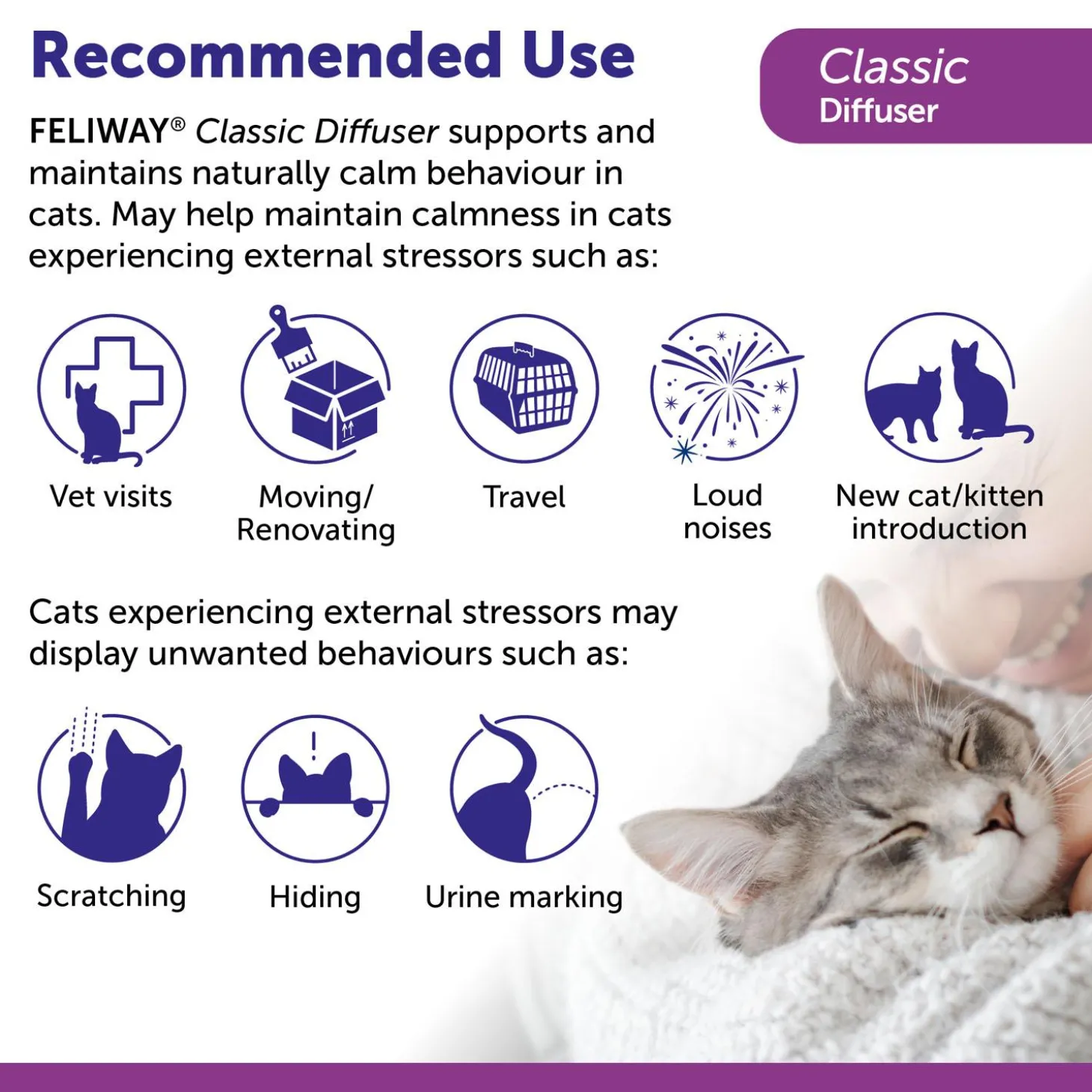FELIWAY Classic 30 Day Diffuser Refill supports and maintains naturally calm behaviour in cats. Cats experiencing external stressors may display unwanted behaviours such as, scratching furniture, urine marking & hiding. FELIWAY Classic is clinically proven to help improve your cats’ well-being, with a hassle-free setup and backed by decades of expertise.