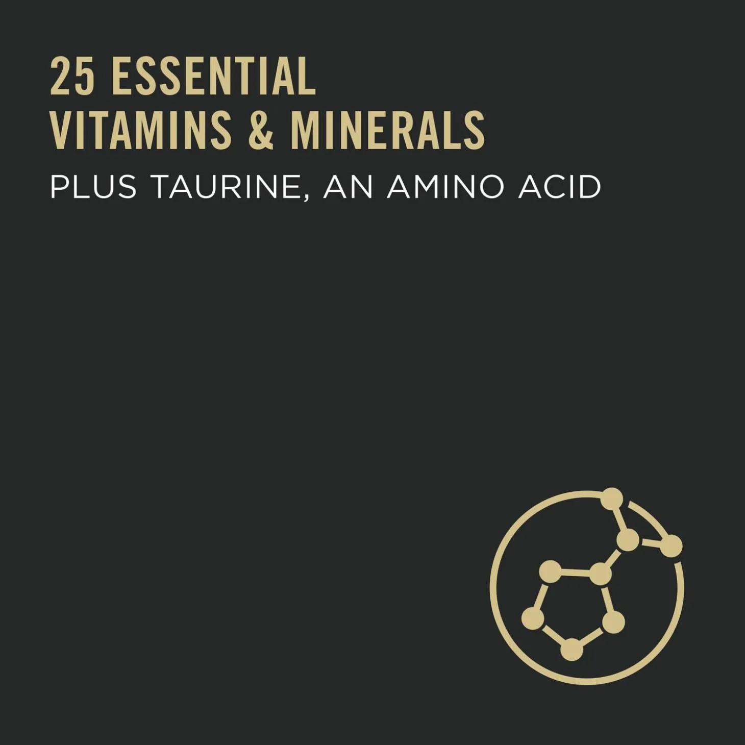 - Provides 25 essential vitamins and minerals, as well as the amino acid taurine,