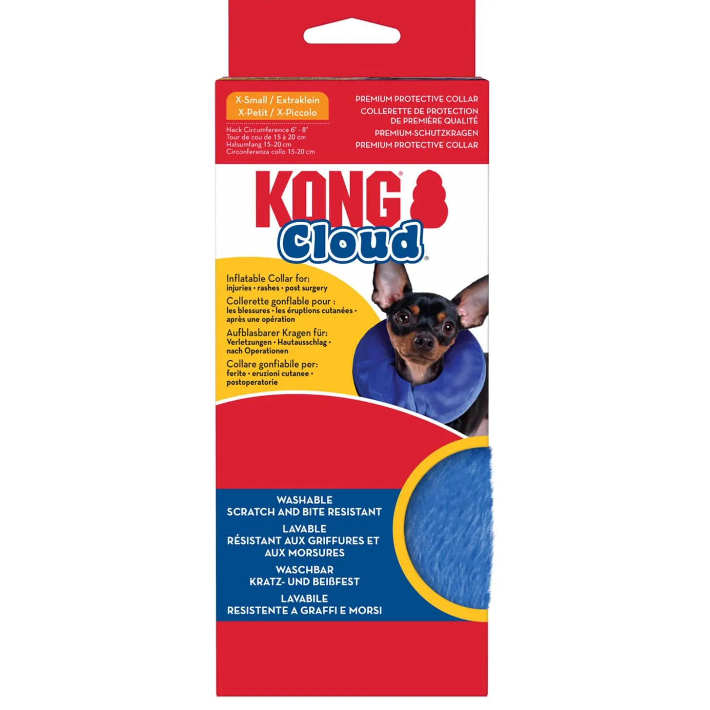 KONG Cloud Inflatable Collar is soft, comfortable, and it doesn’t interfere with a pet’s peripheral vision or their ability to eat and drink. It’s great for dogs or cats recovering from surgery or wounds. This soft, machine-washable collar is a comfy, less stressful way to help keep dogs safe while they heal.