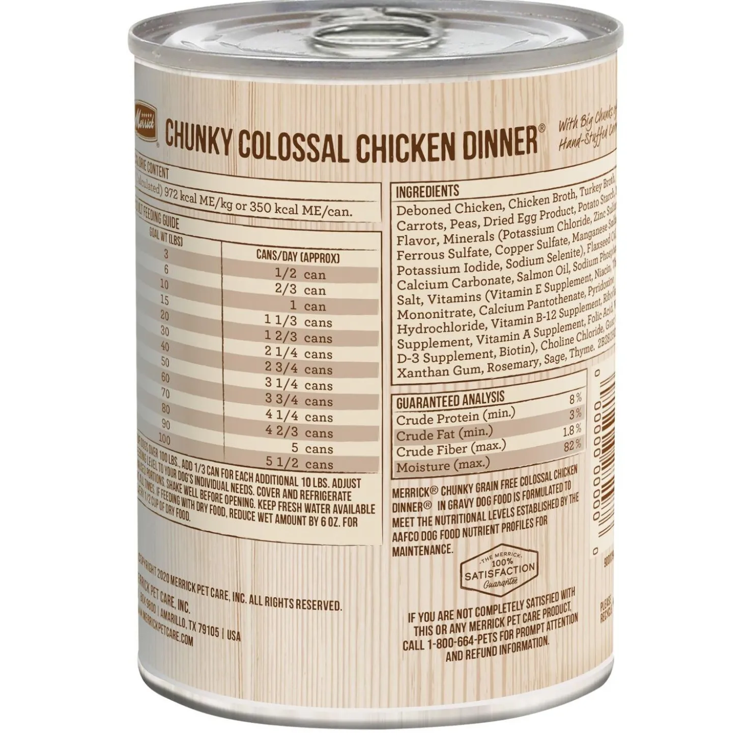 Merrick Colossal Chicken Chunky Dinner Adult Dog Food is the perfect meal for your pup. The first ingredient in this delectable, real meat dog food is always real, wholesome USDA-inspected deboned chicken. Pop open a can of this adult dog food grain free recipe and fill your dog’s bowl with the big chunks of chicken with hand-stuffed peas and carrots, all in a mouth-watering gravy for a natural dog food. This canned dog food recipe makes any mealtime special, and the addition of a savory gravy gives your dog something to look forward to. This Merrick grain free dog food canned recipe can be served as a topper for dry kibble or a standalone meal. Merrick wet dog food comes in a convenient pull-tab can that makes preparing your dog’s meal quick and easy. Merrick dog food recipes are crafted in Hereford, TX kitchen and cooked in the USA.