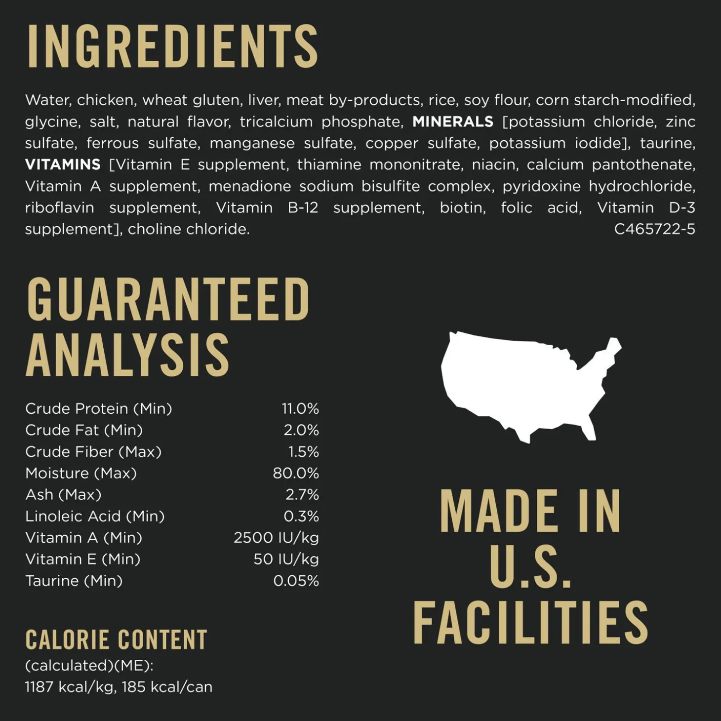 Purina Pro Plan Complete Essentials Chicken & Rice Entree Adult Cat Food is a high protein canned cat food that is made with real chicken and rice for a taste cats love. A savoury gravy delivers delicious flavour and moisture to every mouthwatering bite of this premium cat food made with no artificial colours or preservatives. Each serving contains antioxidants for a healthy immune system and linoleic acid and vitamin A for skin and coat health. The soft cat food contains vitamin A and taurine to support healthy vision and provides 100 percent complete and balanced nutrition for adult cats in a formula that’s high in protein to help maintain muscle. Let your cat delight in the delicious taste and tender texture of this real chicken cat food and watch as the enticing aroma tempts them to their dish. Give them a sensory experience that enriches their mealtime experience while you get the confidence that comes from giving them nutrition that performs.