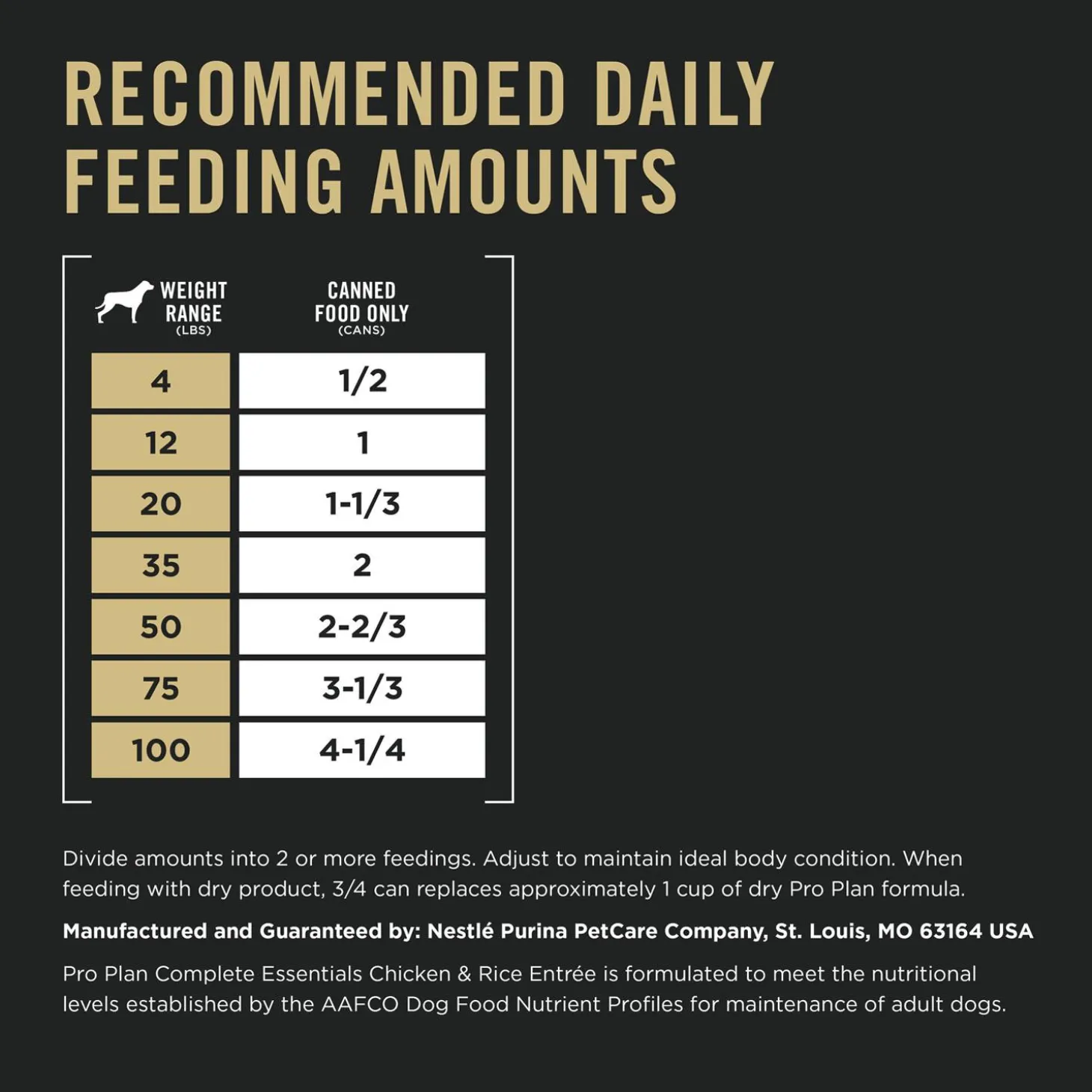 Purina Pro Plan Complete Essentials Classic Chicken & Rice Entree Adult Dog Food will help fill your dog’s bowl with outstanding taste without compromise. Real chicken is the #1 ingredient in this canned pate dog food with rice for a taste dogs love, and every high-quality ingredient is carefully chosen for a specific nutritional or functional purpose. This dog food loaf helps support their healthy immune system and is crafted with no artificial colours, flavours, or preservatives to meet your high standards. The tender texture and delicious taste keep your dog coming back for more, and 23 essential vitamins and nutrients help support their overall health and wellness. Plus, high protein in this canned dog food pate supports an ideal body condition, and real chicken helps provide the high-quality protein they need to build lean muscles. This super-premium dog food delivers 100% complete and balanced nutrition for adult dogs, so you know your dog is getting a meal that’s both tasty and nourishing.