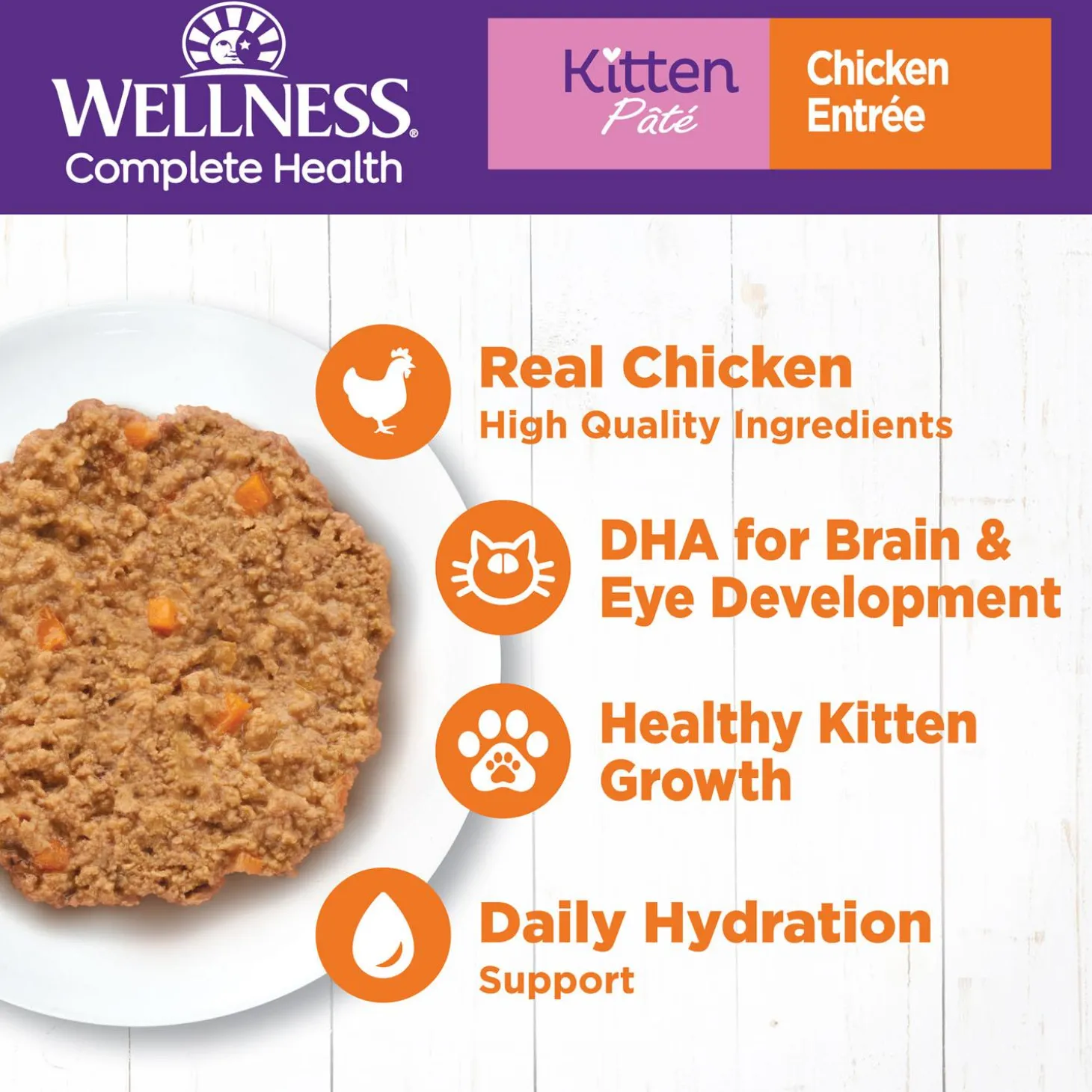 Wellness Complete Health Kitten Pate Chicken Entree Kitten Cat Food is made to support the specific nutritional needs for growing kittens with healthy protein, added DHA for brain development and taurine for eye health. This recipe is an excellent source of high-quality protein and essential fatty acids, and is made with natural, wholesome ingredients with no added grains, carrageenan, or artificial colours, flavours, or preservatives. Wellness Complete Health wet recipes are thoughtfully crafted by a team of vets and nutritionists and are made in North America using high-quality, natural ingredients to deliver delicious meals that support whole-body health and ensure you and your kitten enjoy a lifetime of wellbeing together.