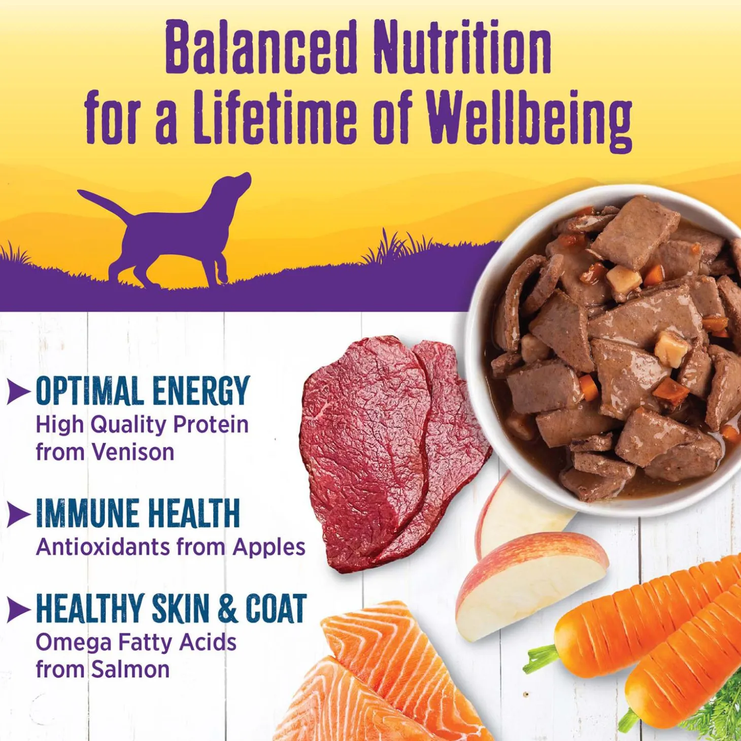 - VENISON & SALMON STEW: features real venison and salmon with potatoes and carrots for complete, balanced nutrition. Wet food features thick, chunky-textured homestyle stew with cuts of protein and veggies in gravy