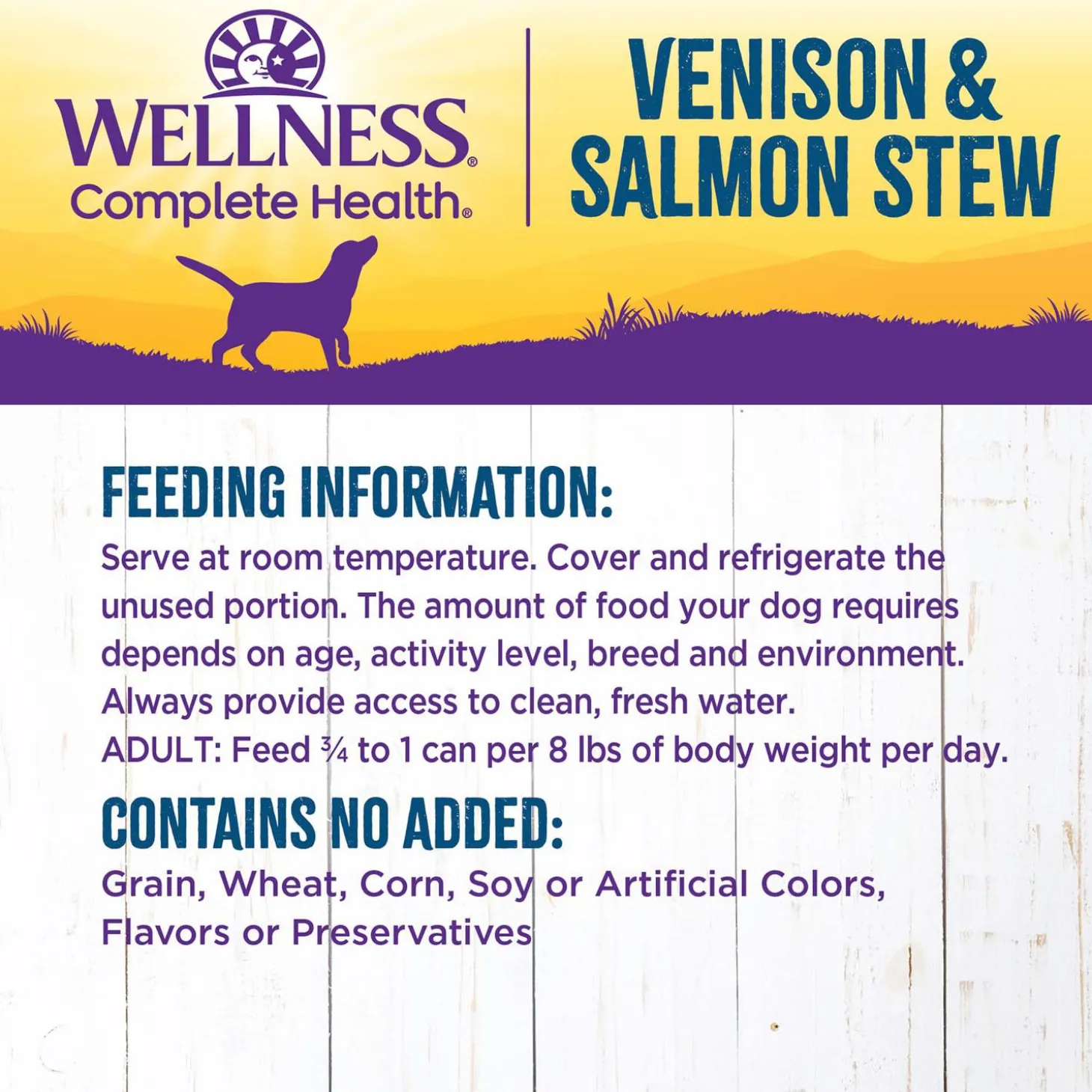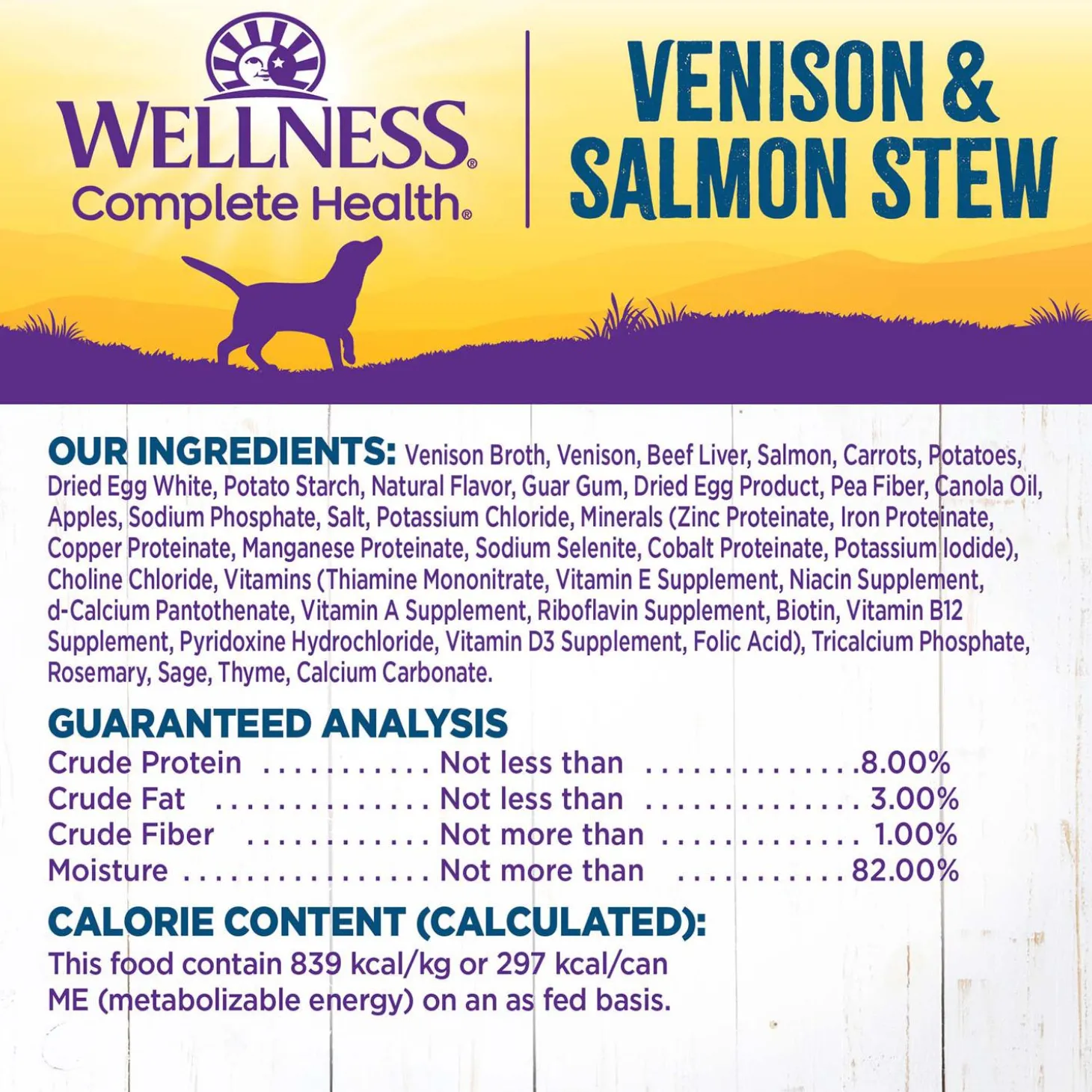 Wellness Complete Health Venison & Salmon Stew with Carrots & Potato Dog Food is a delicious, chunky, slow-cooked homestyle stew with tender cuts of premium protein and veggies in a savoury gravy. Complete and balanced for everyday feeding, mixing or snacking!