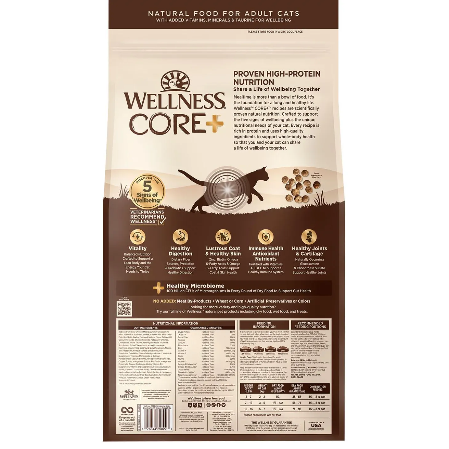 Wellness CORE Deboned Chicken, Tukey & Chicken Meal Recipe Adult Cat Food is based on the nutritional philosophy that cats, given their primal ancestry, thrive on a diet mainly comprised of meat. This grain free Indoor recipe naturally delivers the protein rich variety your cat craves. Crafted by a team of pet nutritionists and veterinarians, each grain-free recipe features high-quality meat with the essential daily vitamins and minerals your cat needs to thrive. Wellness dry cat food does not contain any added carrageenan, wheat, wheat gluten, corn, soy, artificial colours, or preservatives.