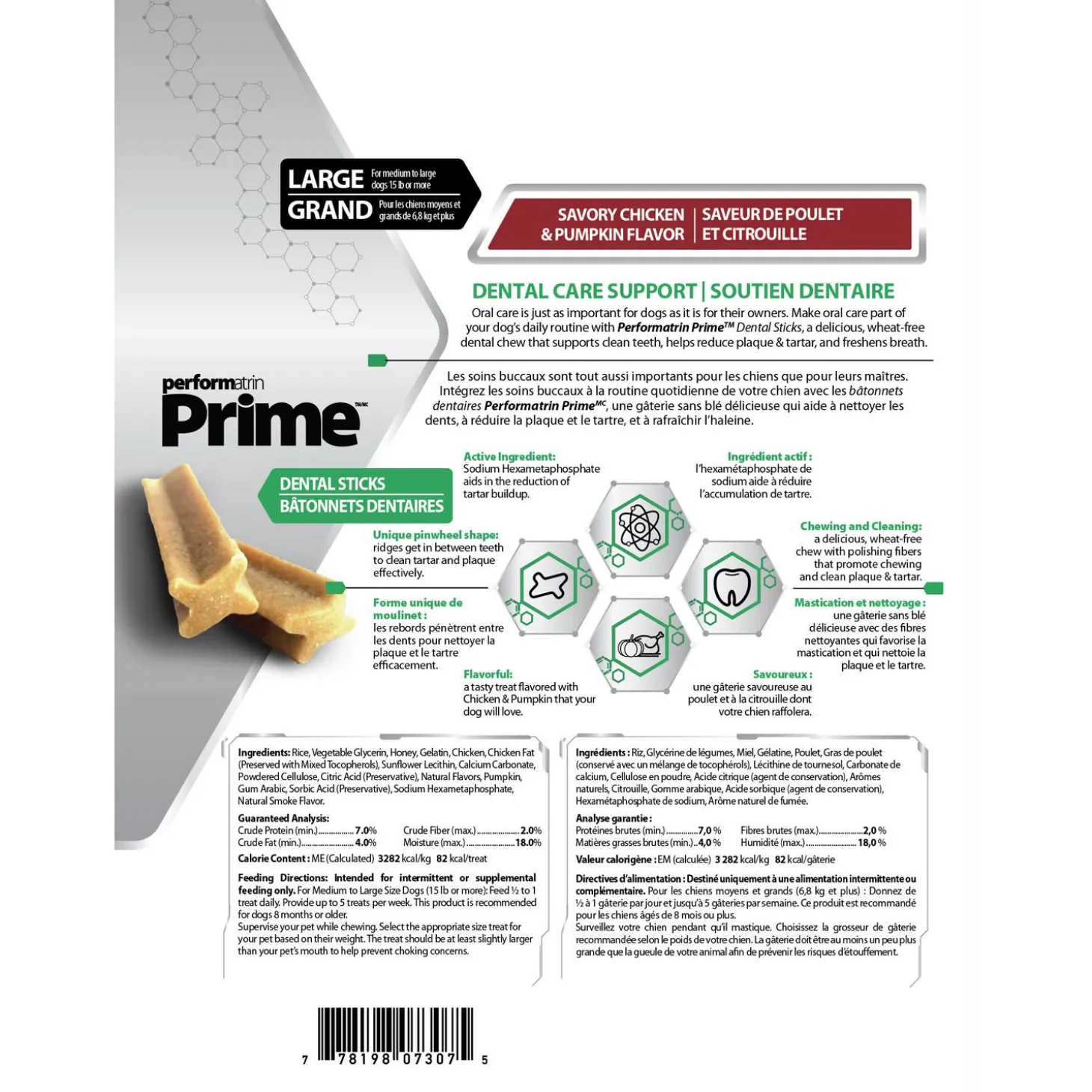 Performatrin Prime Dental Sticks Savoury Chicken & Pumpkin Flavour Large Dog Treats are ideal for medium to large dogs 15lb (6.8 kg) or more. They are delicious, wheat-free dental chews that support clean teeth, help reduce plaque & tartar, and freshens breath. Oral care is just as important for dogs as it is for their owners. Make oral care part of your dog’s daily routine with Performatrin Prime Dental Sticks!