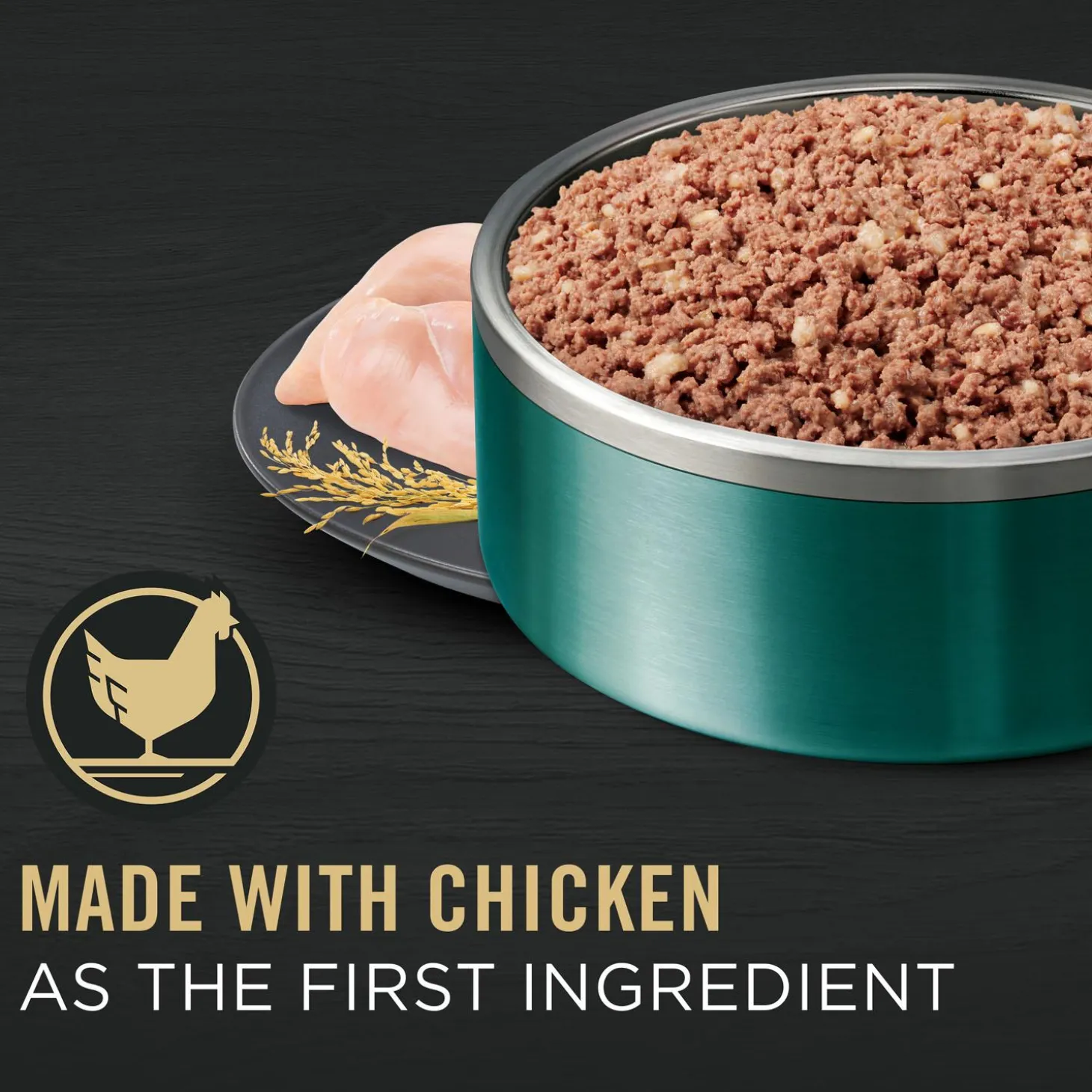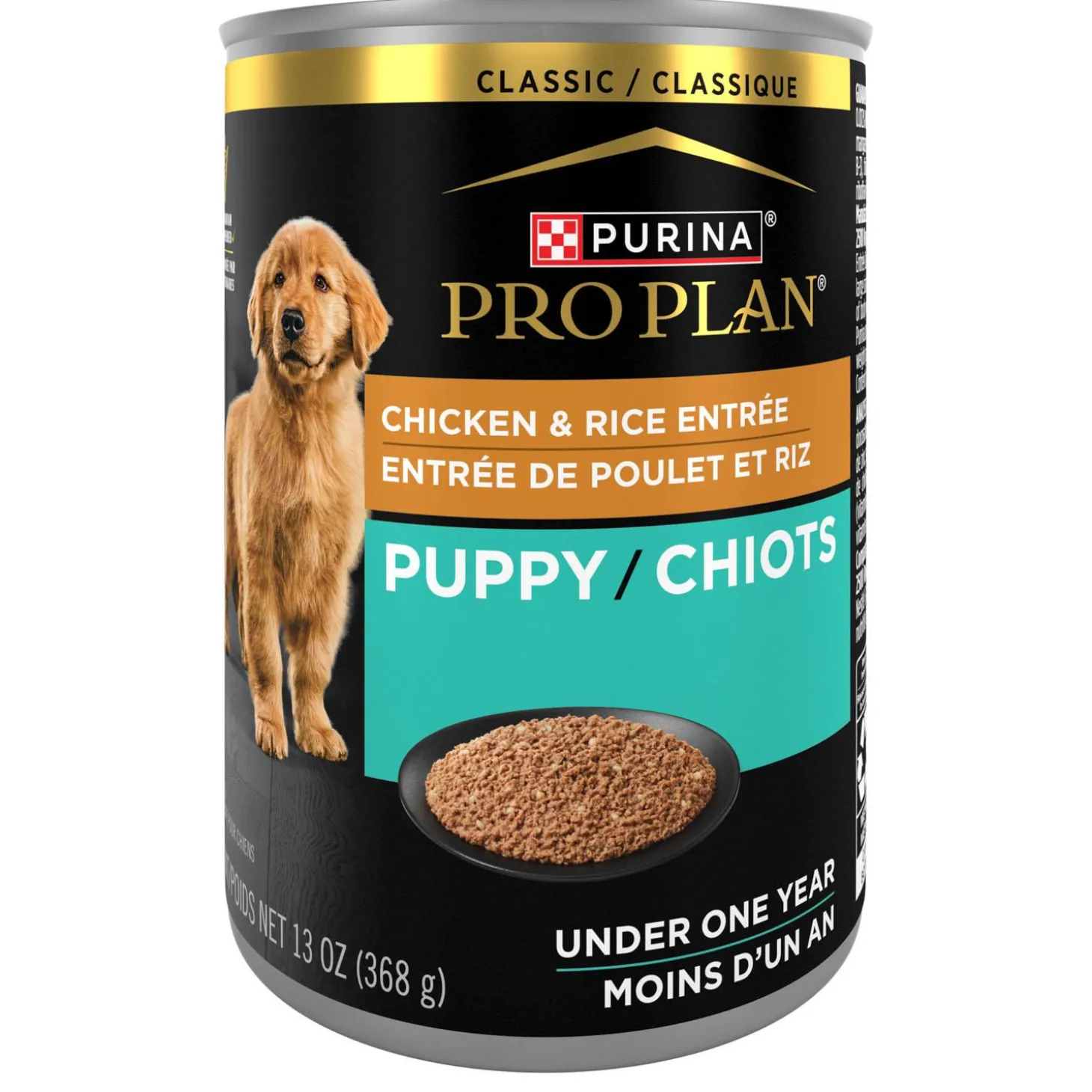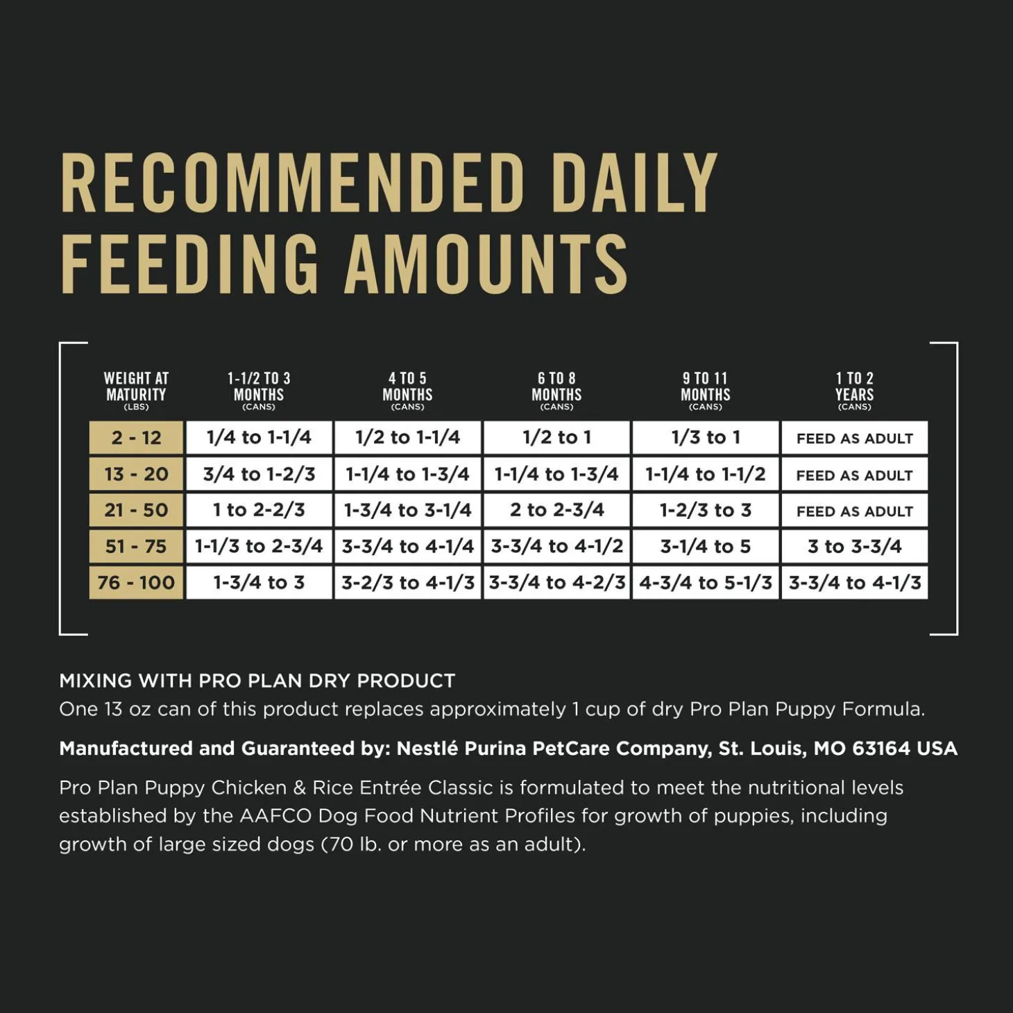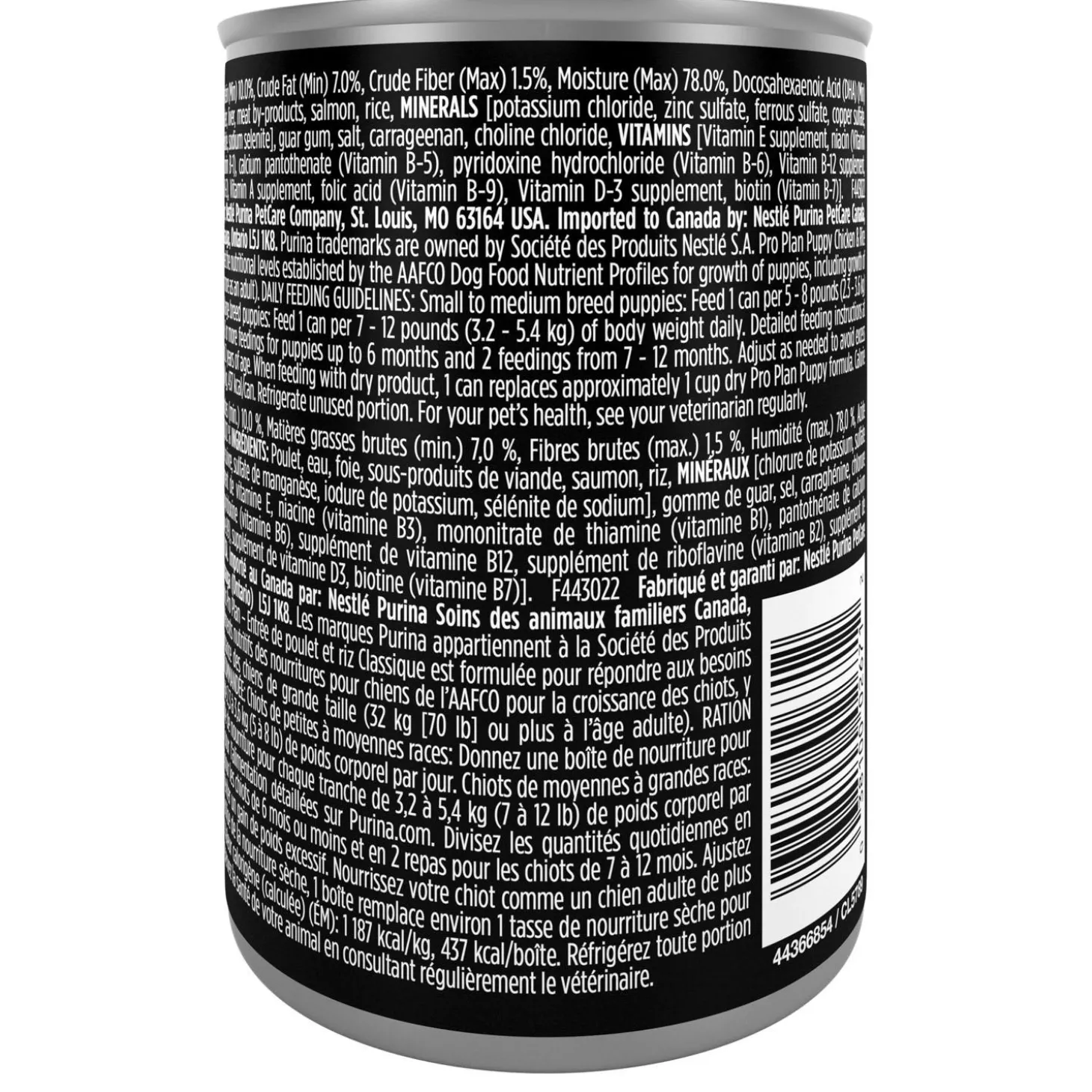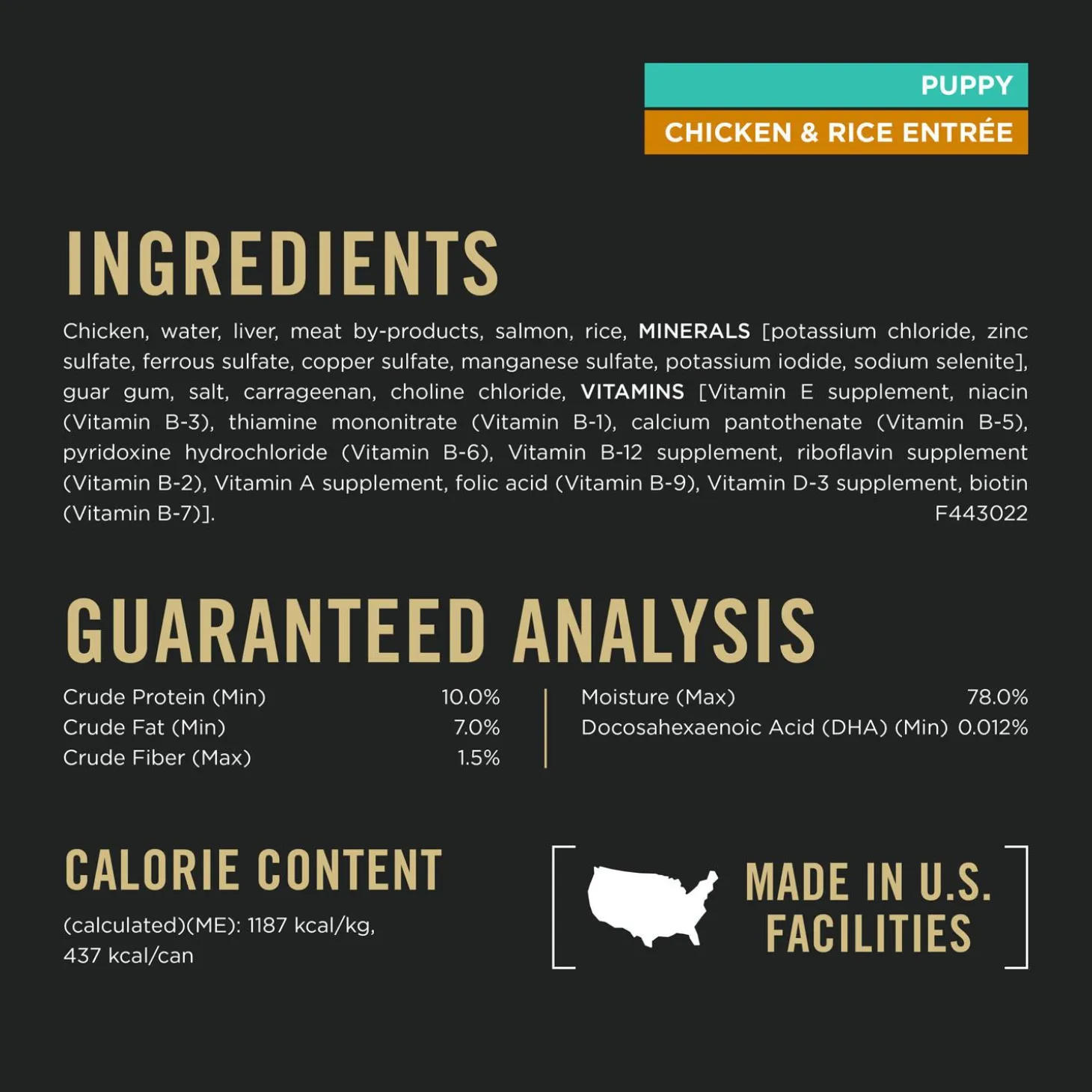 Purina Pro Plan Development Chicken & Rice Entree Puppy Dog Food gives your growing puppy specialized nutrition to meet their unique needs. This canned dog food for puppies up to 1 year old features real chicken as the first ingredient to help provide the high-quality protein your puppy needs to build lean muscles. Every serving is specially formulated for your developing puppy using high-quality ingredients and no artificial colours, flavours or preservatives. The great taste helps your puppy stay engaged at mealtime so they get the nutrition they need to be their best. This high protein puppy food formula also contains 23 essential vitamins and minerals and is 100% complete and balanced for puppy growth and development. Your puppy gets a super-premium wet puppy food that helps to support their developing immune system while nourishing their healthy skin and coat. Plus, DHA in the Chicken and Brown Rice Entree helps support your puppy’s brain and vision development. Focus on your puppy’s health and wellness when you make Purina Pro Plan puppy food part of their daily feeding routine, and provide them with nutrition that performs at mealtime.