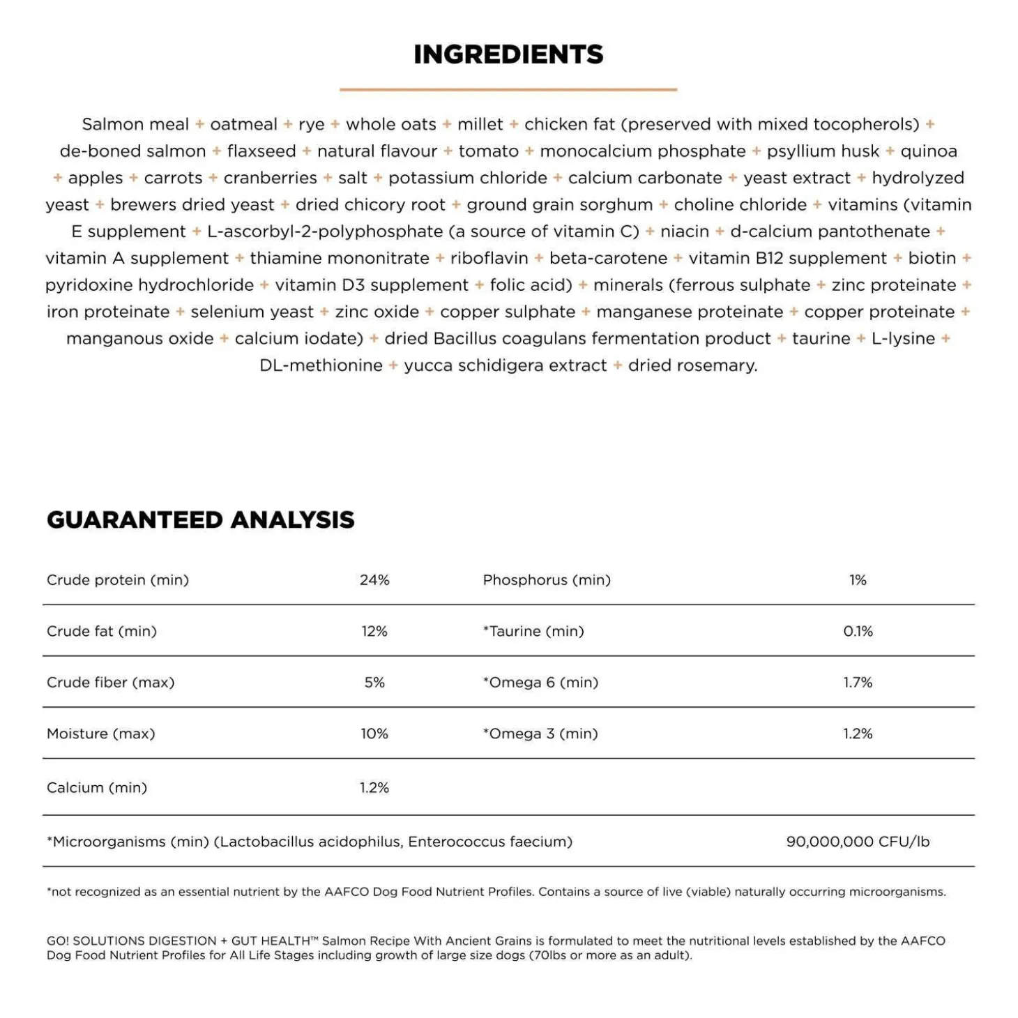 Go! Solutions Digestion + Gut Health Salmon Recipe with Ancient Grains Dog Food is a great choice for your furry friend. Made in Ontario, Canada with premium-quality ingredients, this recipe features a blend of fibre-rich ancient grains, prebiotics, and probiotics to help support good digestion, a healthy gut, and the overall wellbeing of your dog.