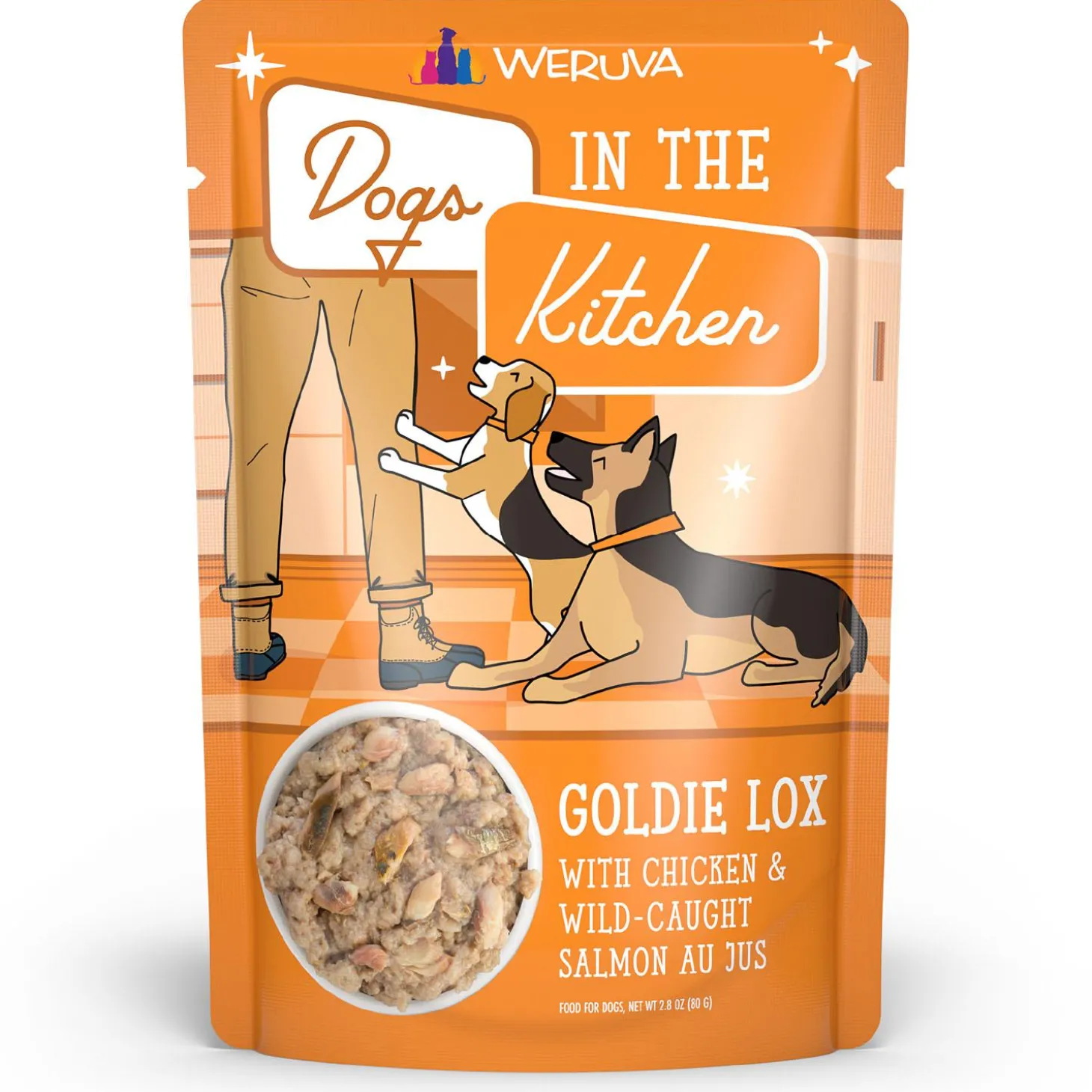 Weruva Dogs in the Kitchen Goldie Lox with Chicken & Wild-Caught Salmon Adult Dog Food is crafted with cage-free chicken and wild-caught salmon in a flavourful au jus, this high-protein pouch is perfect for keeping picky eaters happy and satisfied. Your pooch will feel like they’ve hit the jackpot with this delicious recipe!