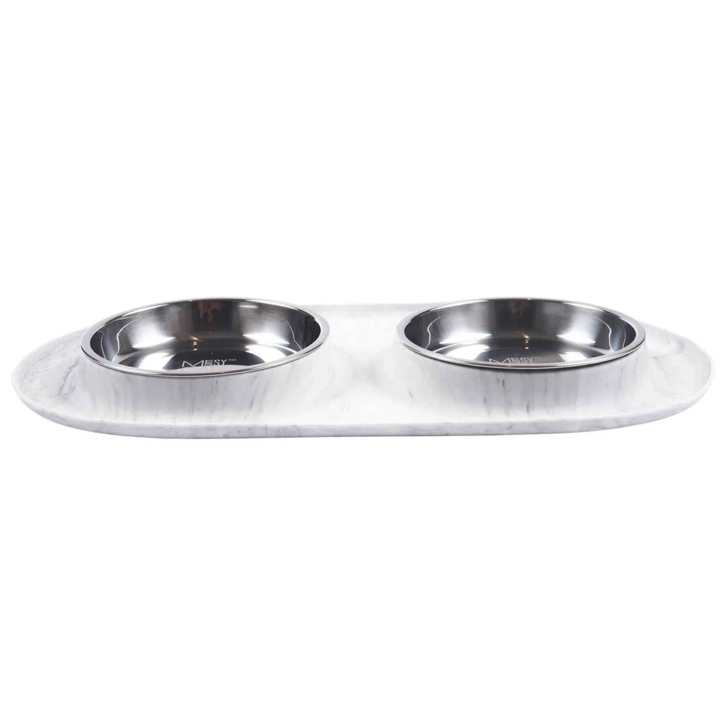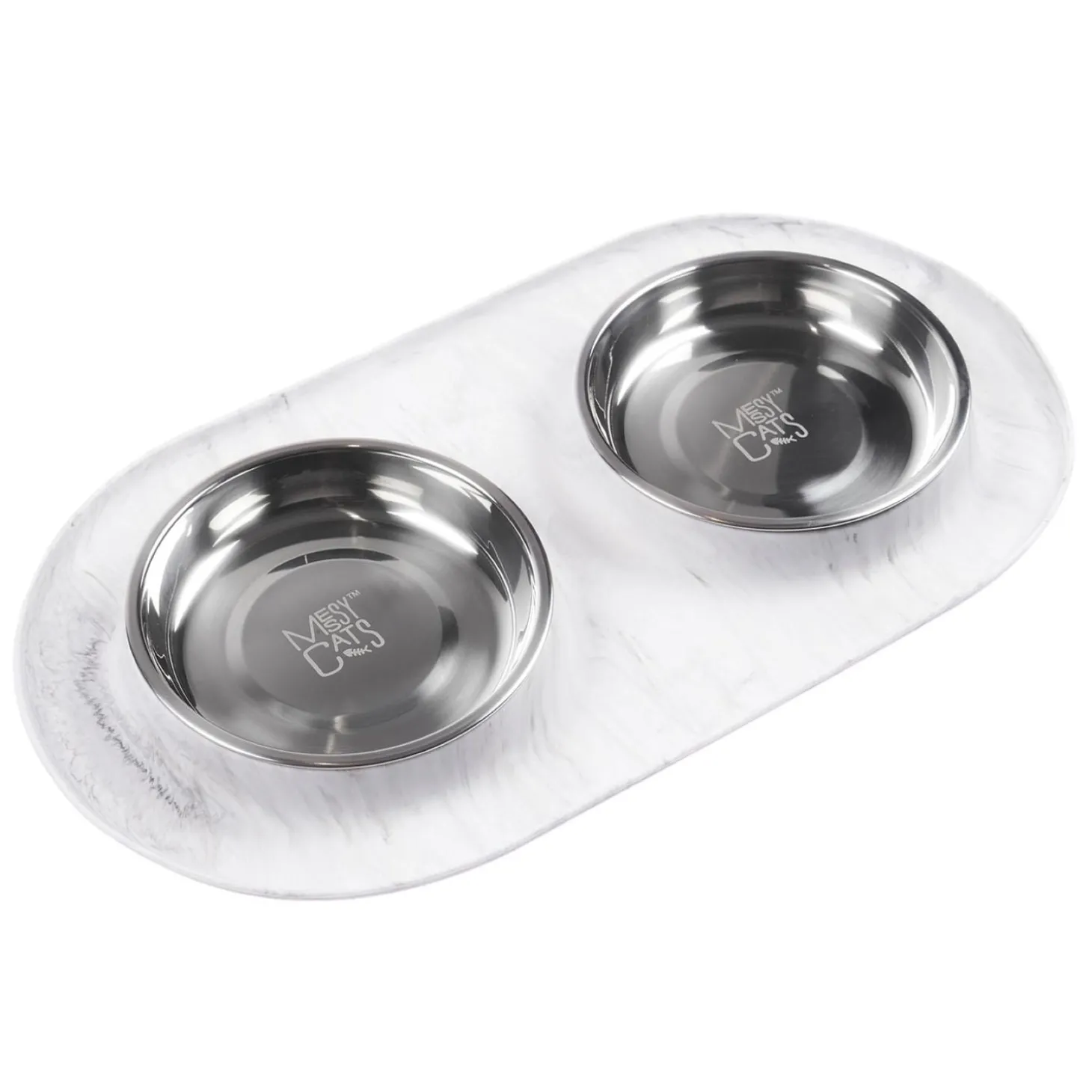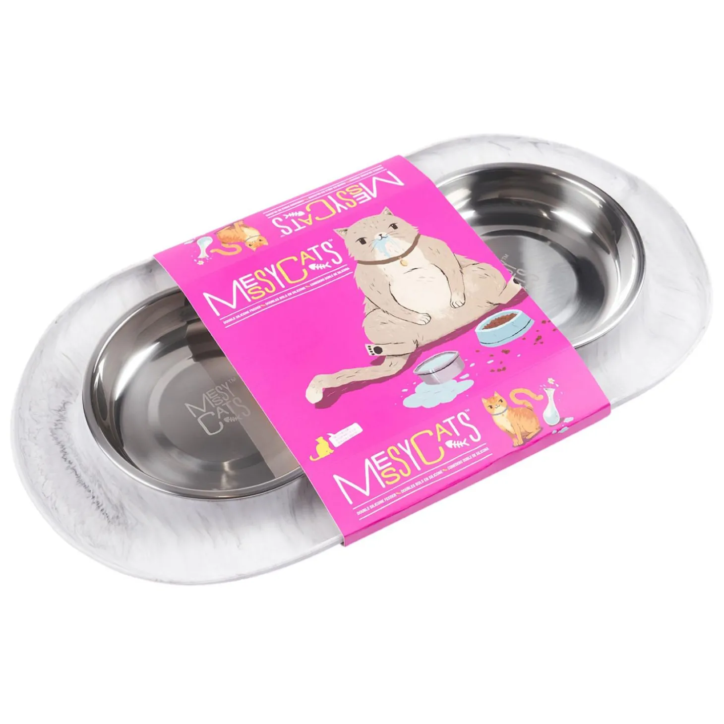 Messy Cats Double Silicone Marble Feeder with Stainless Saucer Shaped Bowls is designed to make sure you can feed your cat and not your floor. The non-slip silicone base prevents damage to your floors and holds the stainless steel bowl in place for your cat. Contain any further messes with the wide lip and raised edge border. The saucer shaped stainless dish is wide with low side to help reduce whisker fatigue and irritation while eating or drinking. The ‘marble look’ silicone base provides grip to keep the bowls in place as well as a raised edge to help contain the spills. Ideal for advanced food prep, travel and preservation.