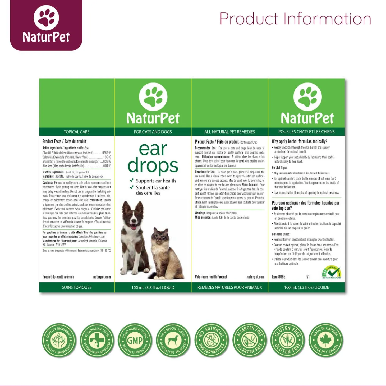 NaturPet Ear Drops provide gentle care for pets with sensitive ears, using a blend of natural oils and herbs known to soothe and support ear cleanliness. Formulated with olive oil, bergamot oil, basil oil, calendula, and aloe vera, these drops help reduce common ear discomforts and odors in dogs and cats, making them ideal for pets prone to scratching or head-shaking. The carefully selected ingredients work to maintain a balanced ear environment, which is essential for pets who may experience build-up or frequent irritation. Regular use helps keep ears clean, reducing the need for more intensive care and giving your pet relief from recurring ear issues.