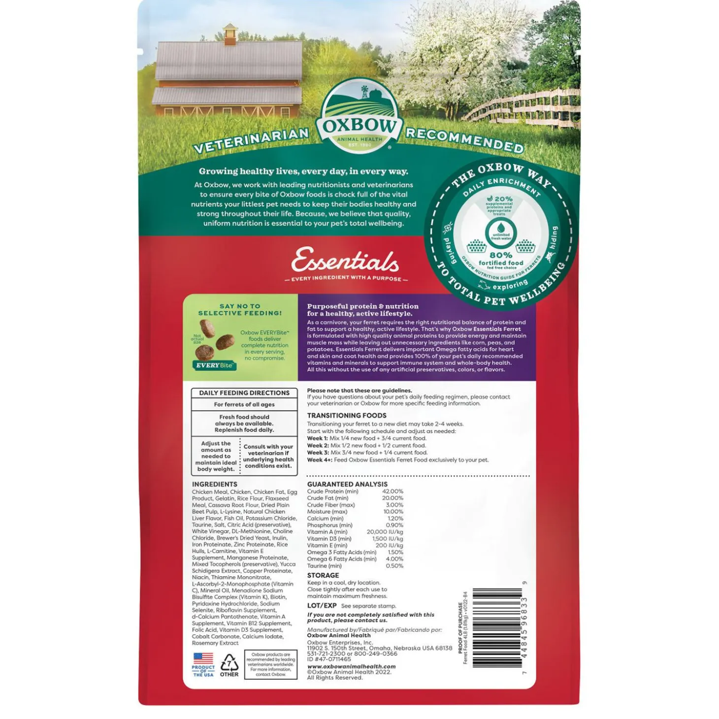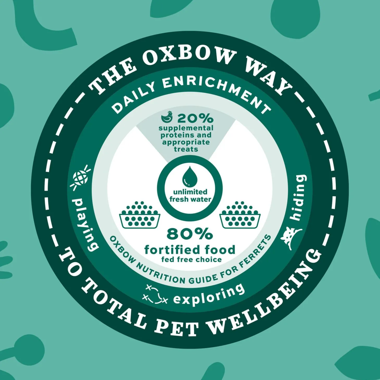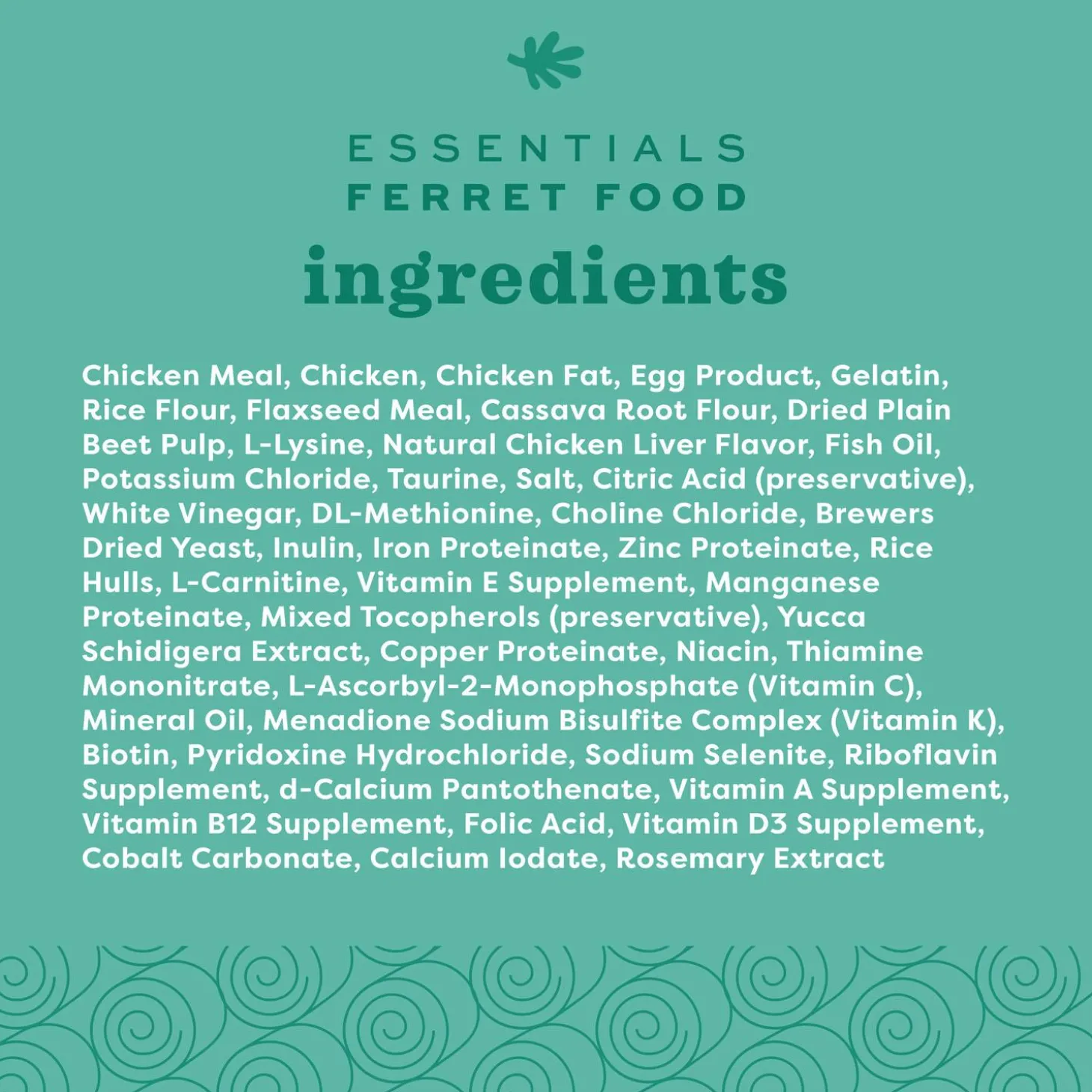 Oxbow Essentials Ferret Food is formulated with high quality animal proteins to provide energy and maintain muscle mass while leaving out unnecessary ingredients like corn, peas, and potatoes. As a carnivore, your ferret requires the right nutritional balance of protein and fat to support a healthy, active lifestyle. Essentials Ferret food delivers important Omega fatty acids for heart and skin and coat health and provides 100% of your pet’s daily recommended vitamins and minerals to support immune system and whole-body health. All this without the use of any artificial preservatives, colours, or flavours.