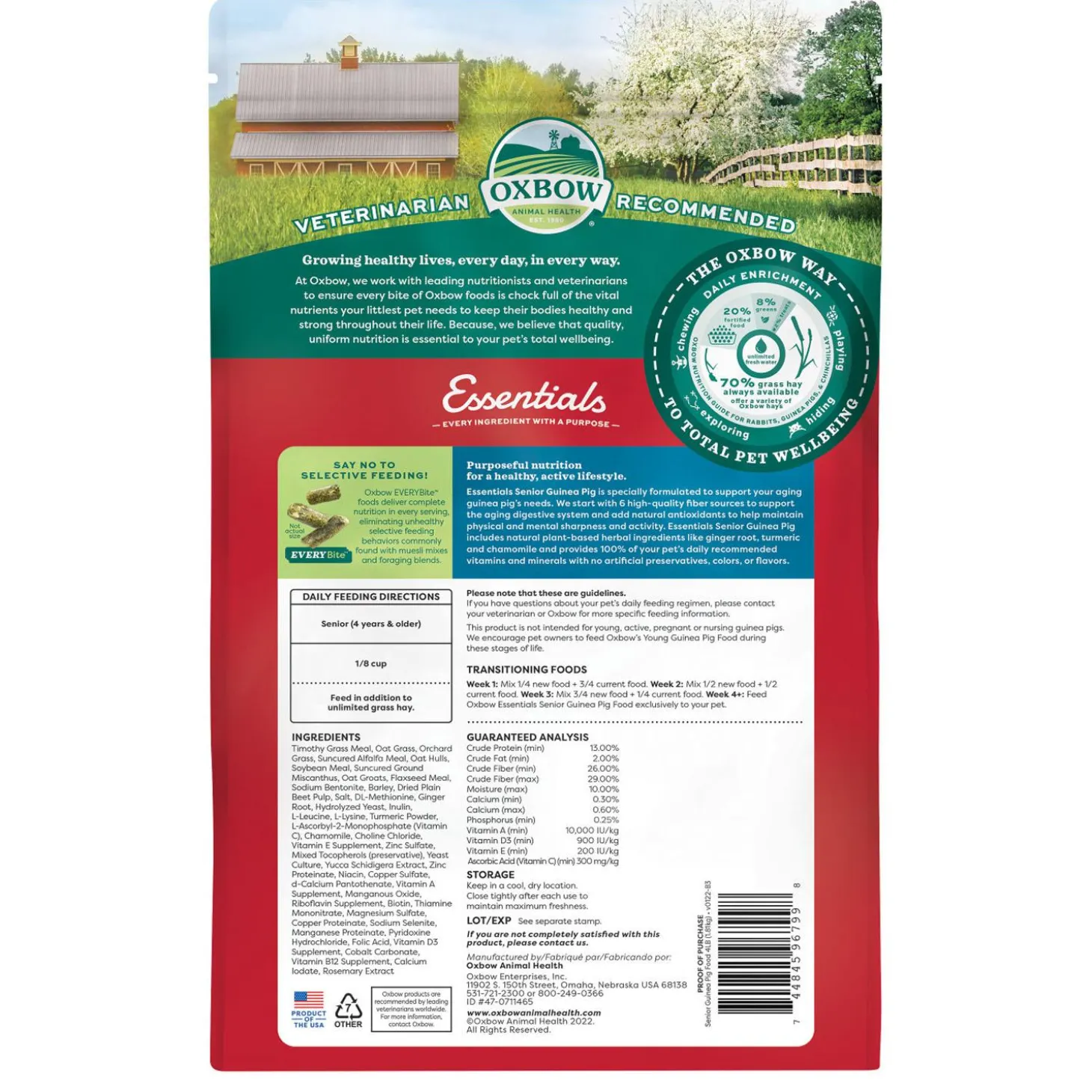 Oxbow Essentials Senior Guinea Pig Food is specially formulated to support your aging guinea pig’s needs. Starting with 6 high-quality fibre sources to support the aging digestive system and adding natural antioxidants to help maintain physical and mental sharpness and activity. Essentials Senior Guinea Pig includes natural plant-based herbal ingredients like ginger root, turmeric and chamomile and provides 100% of your pet’s daily recommended vitamins and minerals with no artificial preservatives, colours, or flavours.
