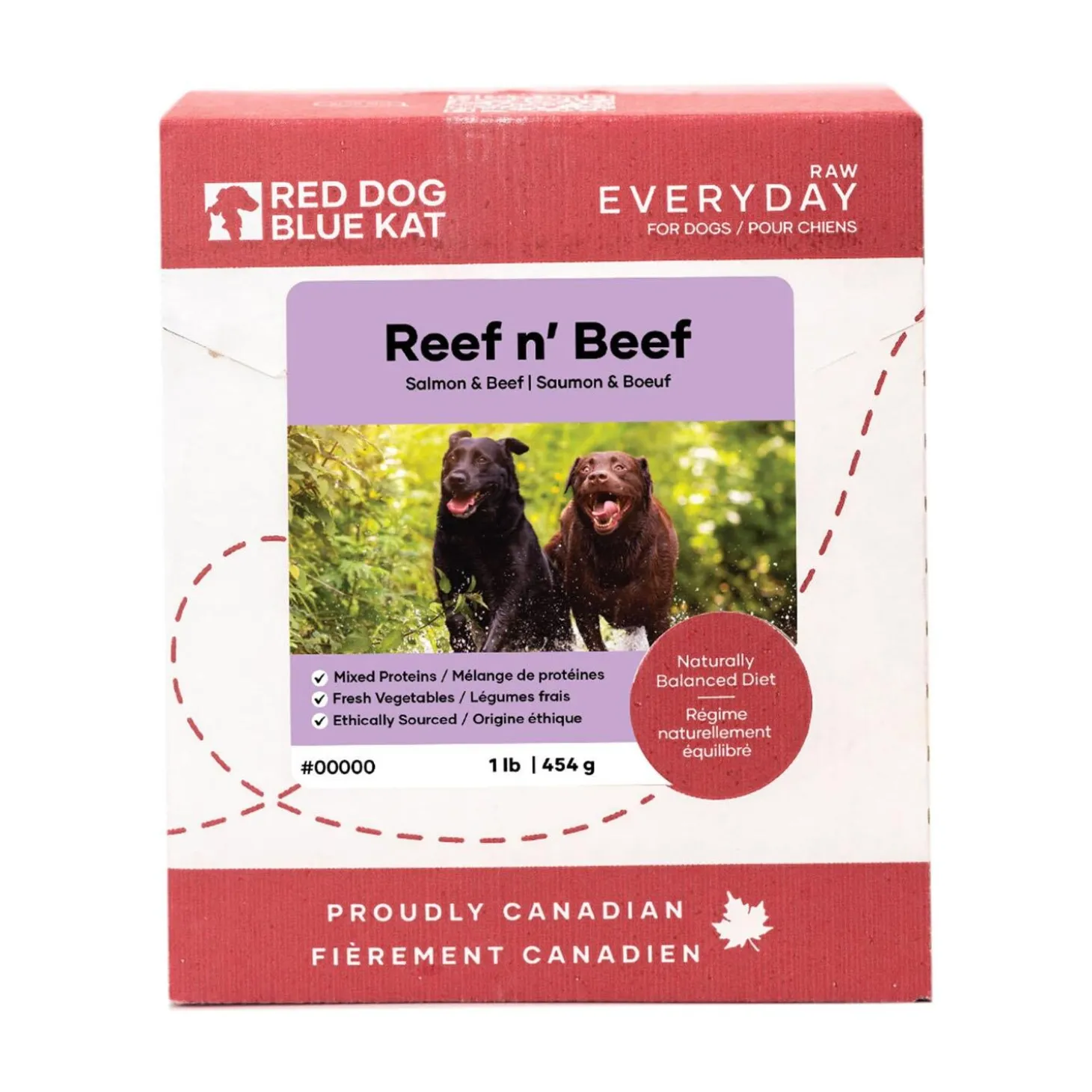 Red Dog Blue Kat Everyday Raw Reef n’ Beef Salmon & Beef 4 Pack Adult Dog Food is designed to make feeding raw easy. This food is an economical blend that includes beef meat and organs combined with wild salmon for a perfect meat medley. Combined with some fresh veggies and blueberries, makes for a nutritious and delicious meal for any pup. This food is naturally balanced to AAFCO adult dog standards and is easy to mix and rotate for an optimal healthy diet.