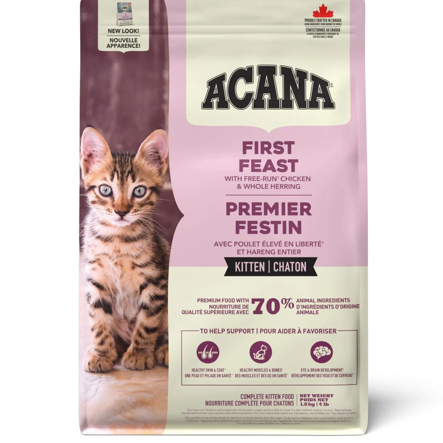 ACANA First Feast Kitten Cat Food helps support your kitten’s growth and development. Rich with 70% quality animal ingredients* including fresh or raw free-run** chicken and whole herring, First Feast has the animal protein your kitten needs to grow up strong. This nutrient-dense recipe also helps support key health benefits for your kitten, including healthy skin & coat, healthy muscles & bones, and eye & brain development. Nurture your kitten with a recipe tailored to help them grow up healthy and happy!
