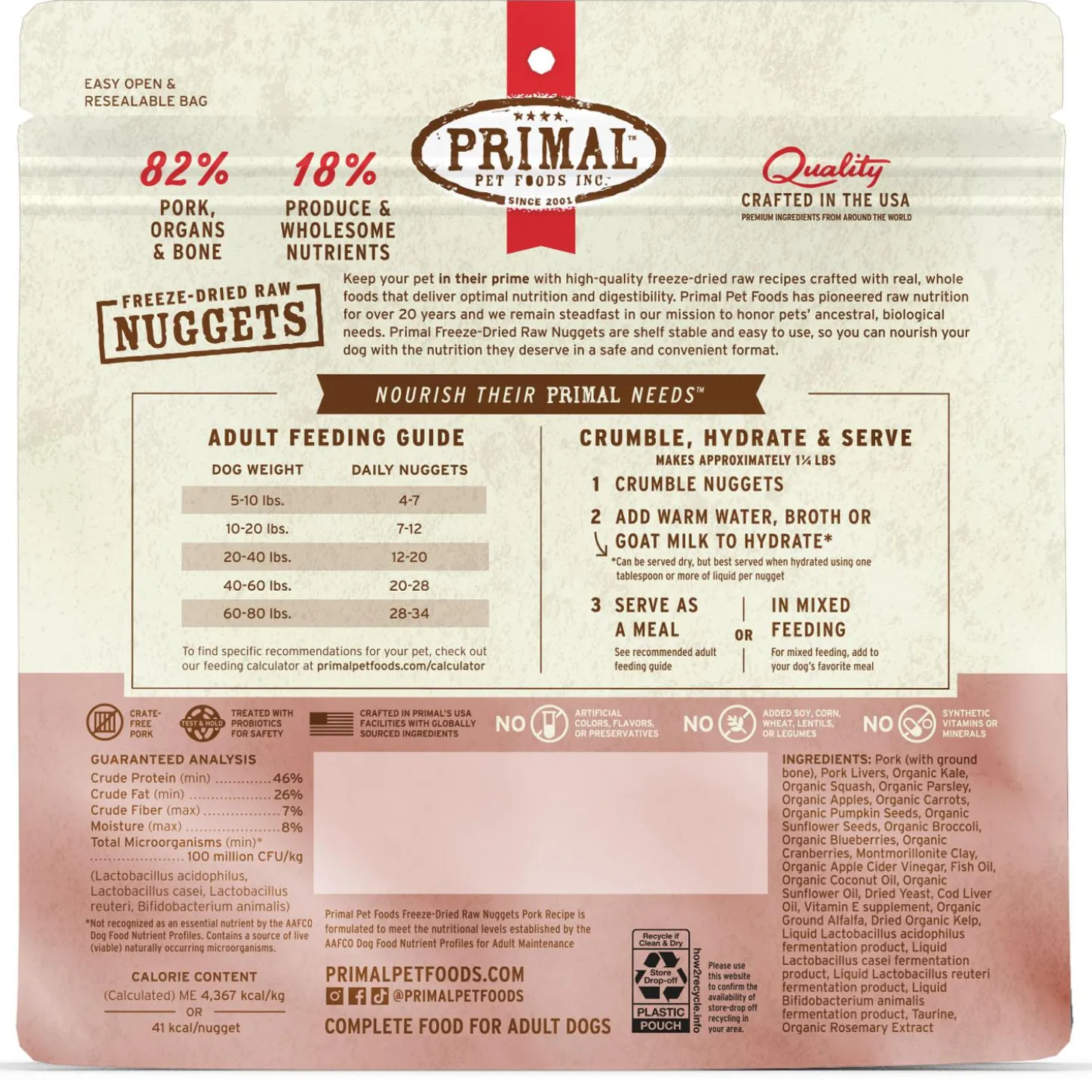 Primal Freeze-Dried Raw Nuggets Pork Recipe Adult Dog Food offers you the convenience and benefits of a well-balanced, safe and wholesome raw-food diet without having to grind, chop, measure or mix the ingredients yourself. Primal Pet Foods takes the time to carefully formulate and produce a nutritious, fresh-food diet that is easy for you to serve and delectable for pets to devour. The proof is watching them lick the bowl clean while thriving happily and healthfully!