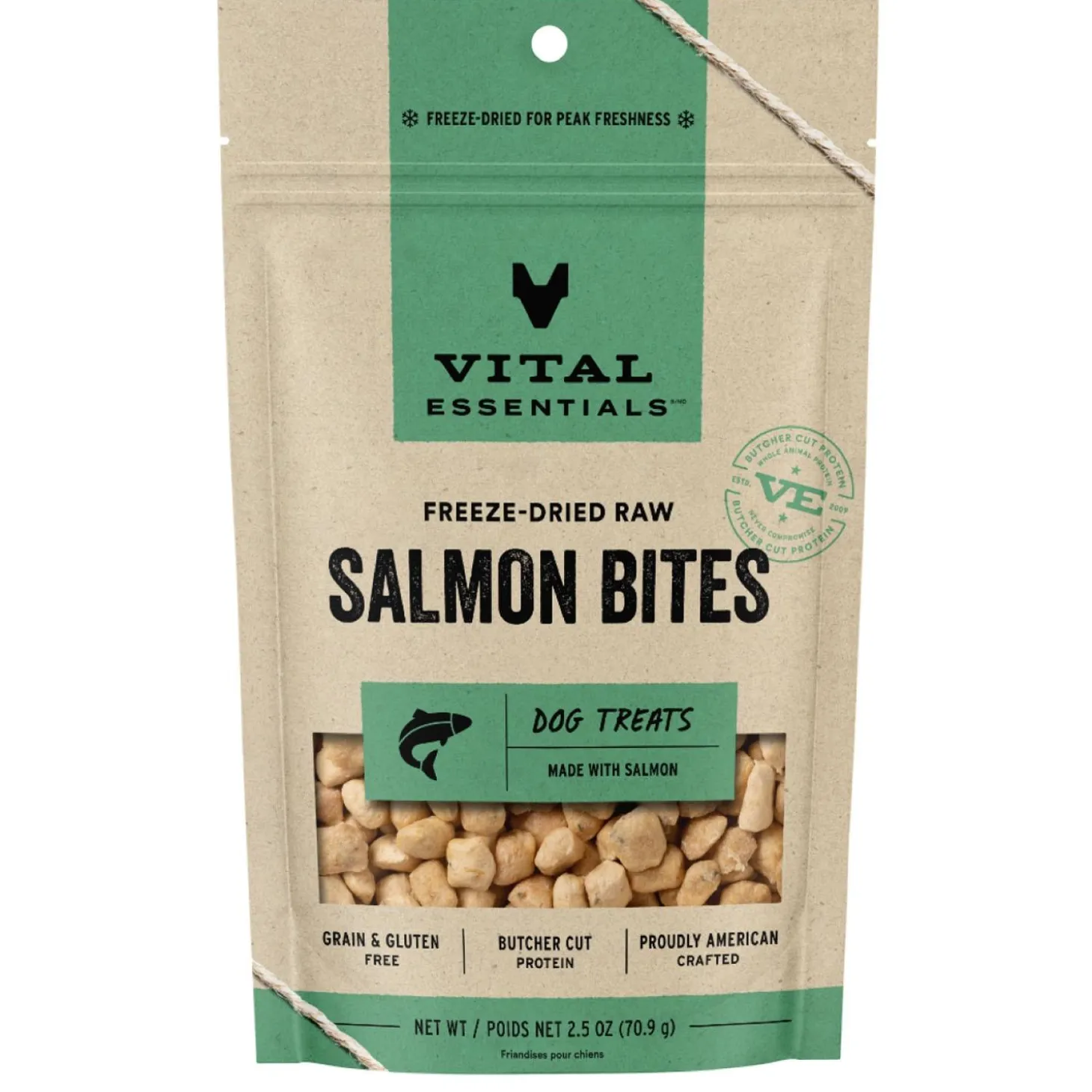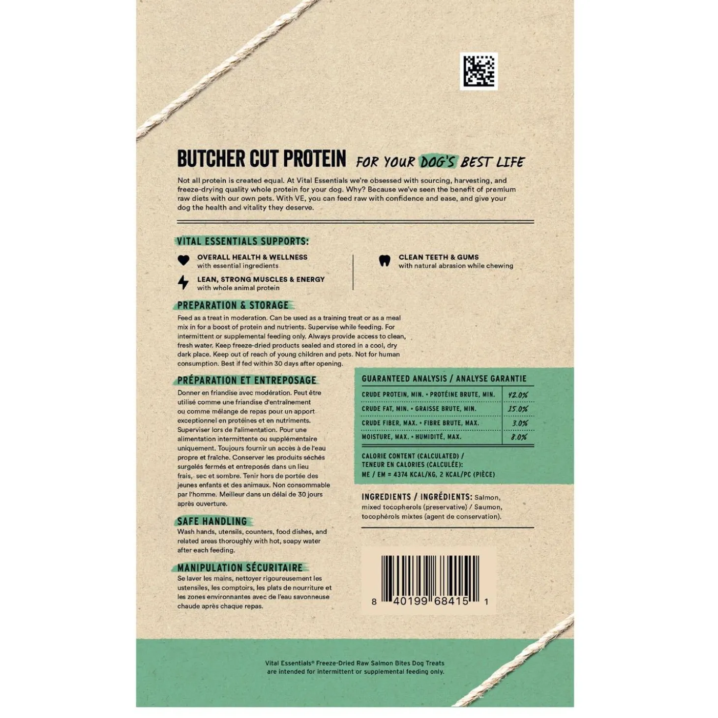 Vital Essentials Freeze Dried Raw Salmon Bites Dog Treats are packed with the naturally occurring vitamins and minerals found in raw protein for an all natural treat that helps dogs look and feel their best. Premium butcher cut protein builds strong muscles for more play, naturally supports digestive and oral health, and provides essential nutrients to support your dog’s vitality.
