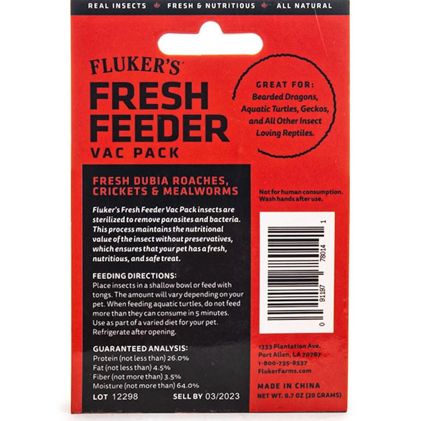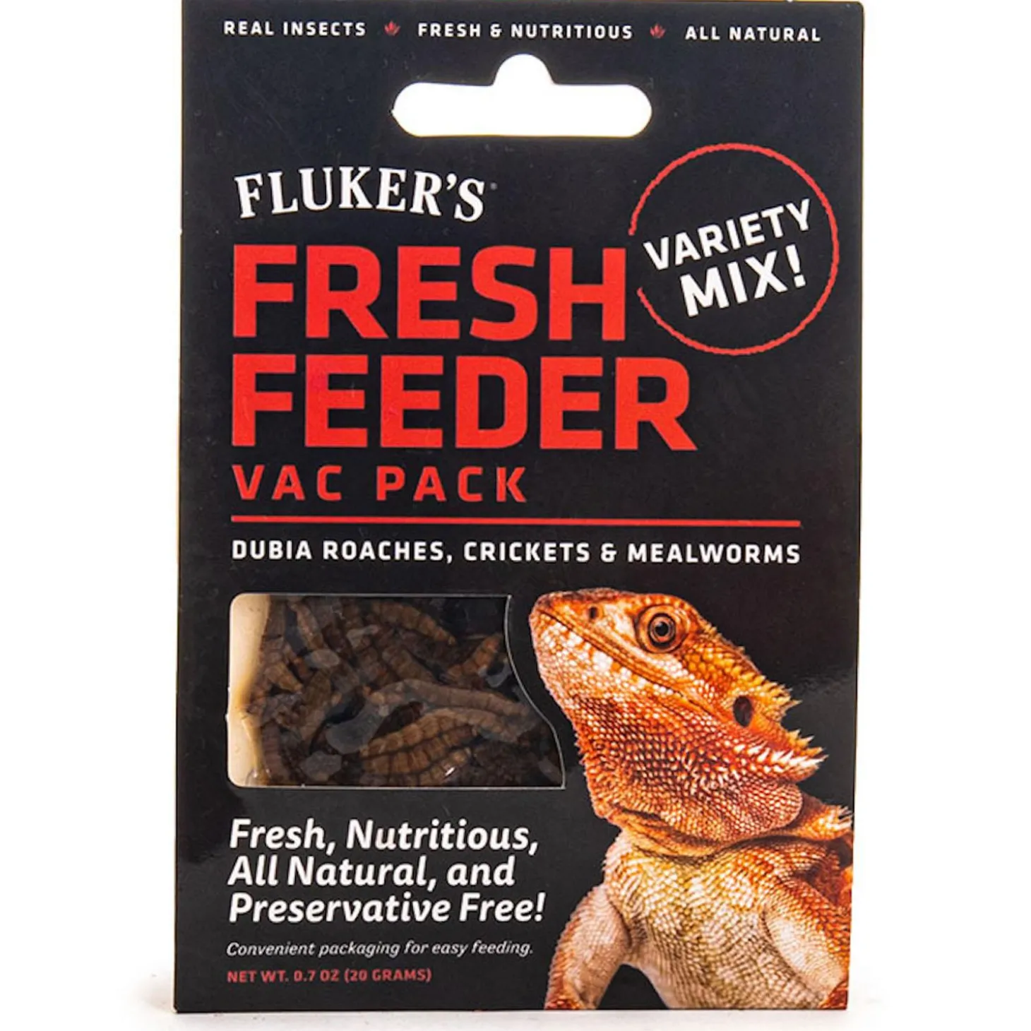 Fluker’s Fresh Feeder Vac Pack Variety Mix Reptile Food makes mealtime simple, nutritious and tasty! This dry food is made with real Dubia roaches, crickets and mealworms, and each batch is carefully sterilized to remove parasites and bacteria while retaining the insects’ natural nutrition and flavour. This food offers a convenient and safe alternative to keeping live feeder insects. It’s also great for use with aquatic turtles, terrestrial turtles, aquatic amphibians, terrestrial amphibians, invertebrates, and lizards