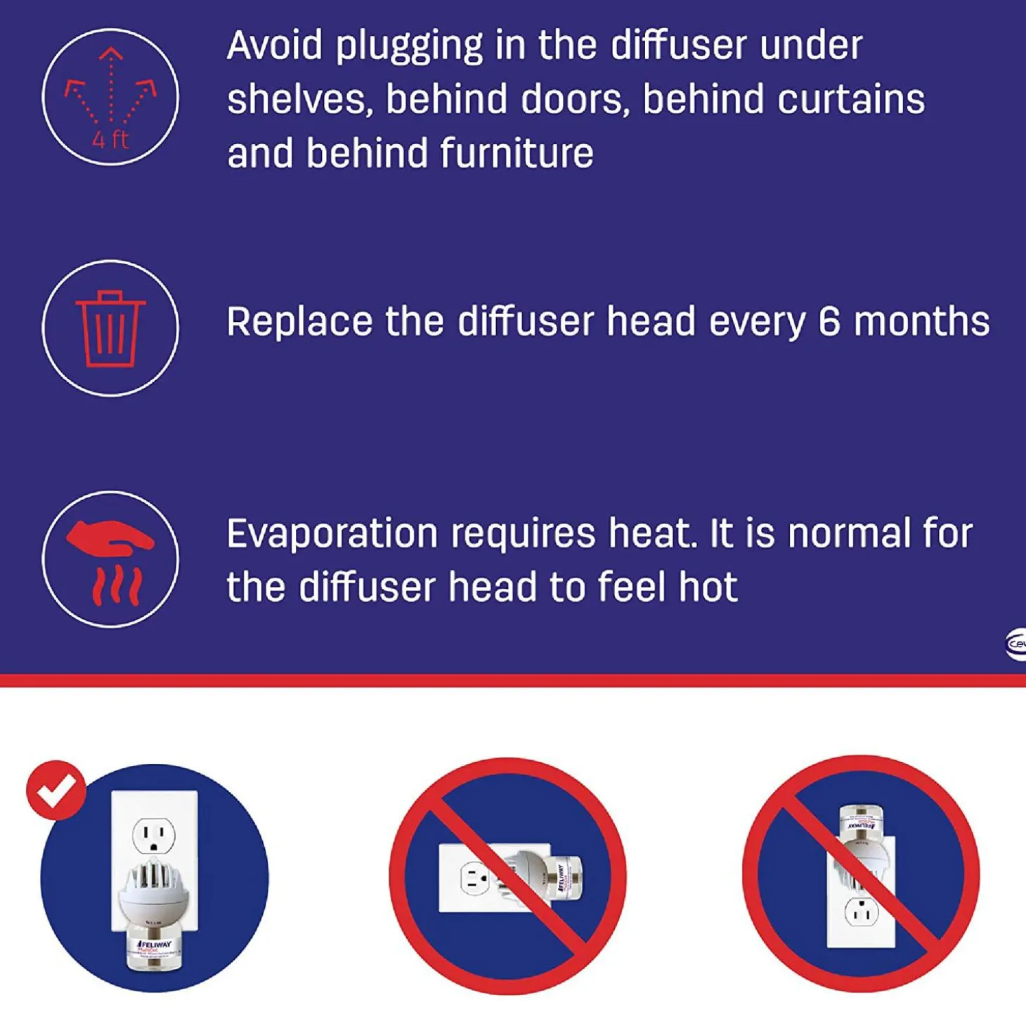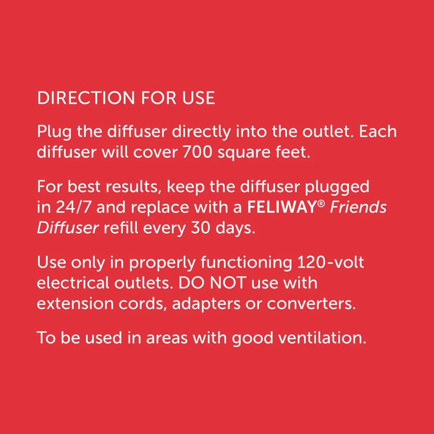Use: Simply insert the refill into the diffuser and plug it directly into the outlet. Each diffuser will cover 700 square feet. For best results, keep the diffuser plugged in 24/7 and replace with a FELIWAY Friends Diffuser refill every 30 days. The diffuser must be replaced every 6 months. Use only in properly functioning 120-volt electrical outlets. Do not use with extension cords, adapters, or converters. Best results are typically seen after 3 to 4 weeks of continuous use. Use only FELIWAY Refills with FELIWAY Diffusers.