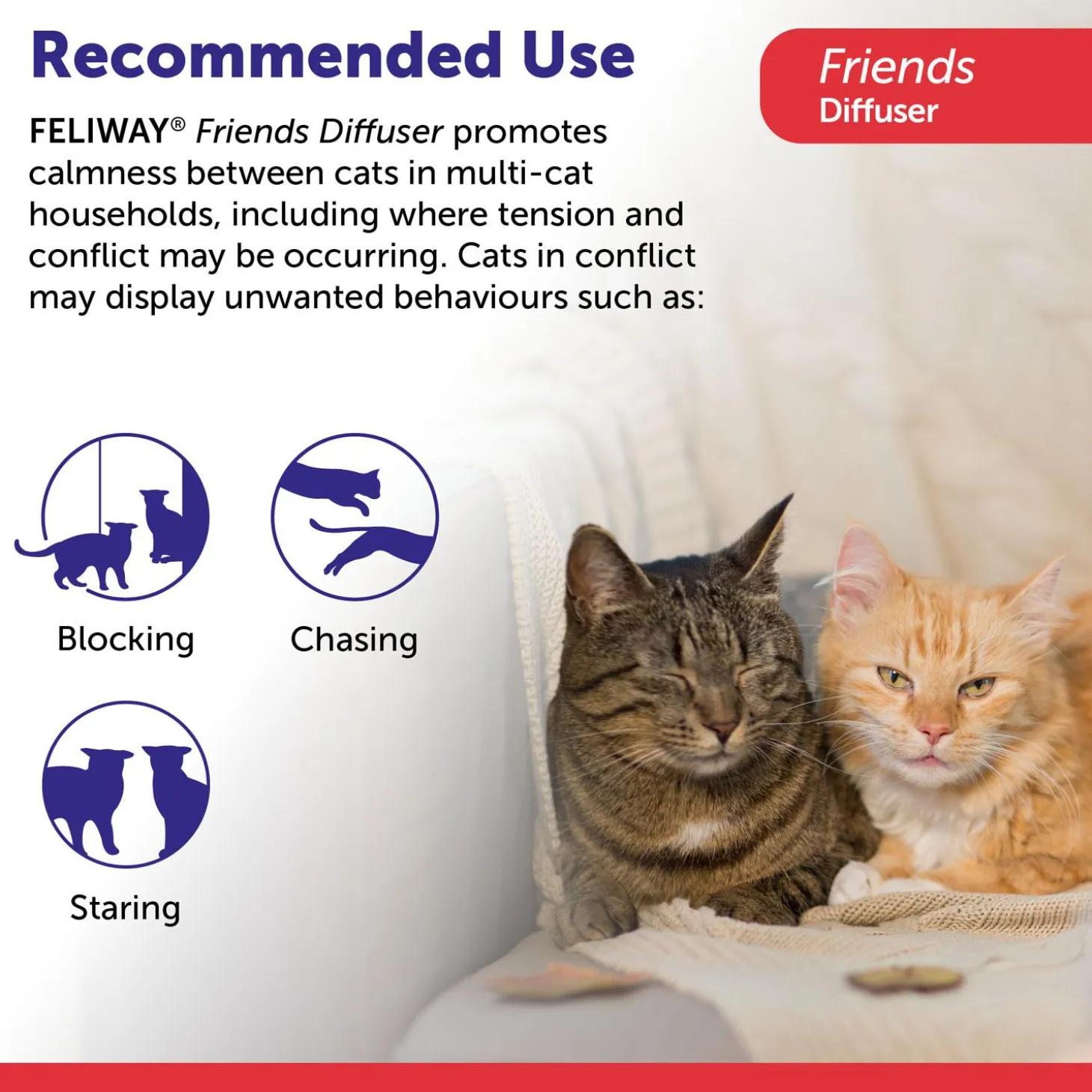 FELIWAY Friends 30 Day Diffuser Refill promotes calmness between cats in multi-cat households, including where tension and conflict may be occurring. FELIWAY Friends is clinically proven to help improve your cats’ well-being, with a hassle-free setup and backed by decades of expertise.