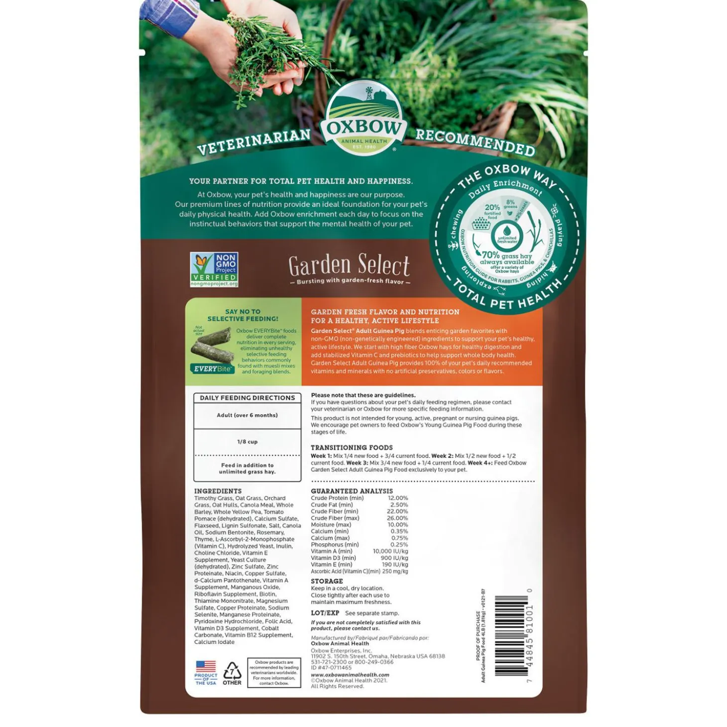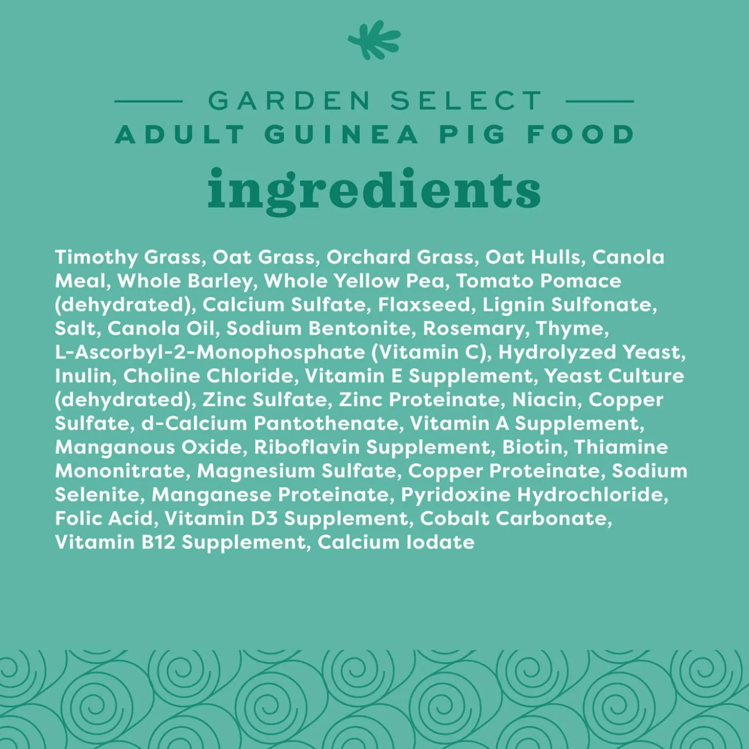 Oxbow Garden Select Adult Guinea Pig Food blends enticing garden favourites with non-GMO (non-genetically engineered) ingredients to support your pet’s healthy, active lifestyle. Starting with high fibre Oxbow hays for healthy digestion and adding stabilized Vitamin C and prebiotics to help support whole body health. Garden Select Adult Guinea Pig Food provides 100% of your pet’s daily recommended vitamins and minerals with no artificial preservatives, colours or flavours.