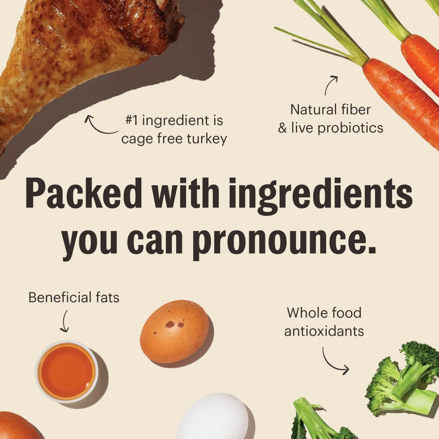 - Packed with human grade whole foods like cage free turkey, natural fibre & whole food antioxidants
