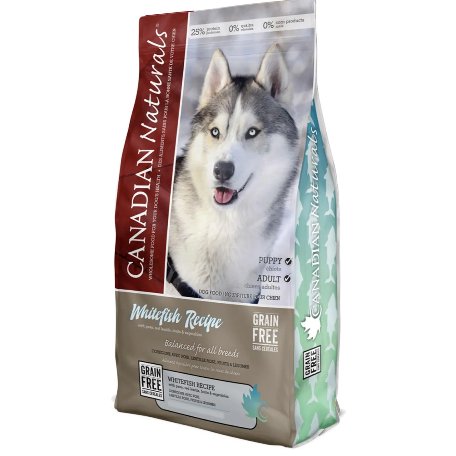 Canadian Naturals Grain Free Whitefish Recipe Dog Food is made with real, fresh fish paired with chicken meal to provide excellent taste with quality protein. Rather than using grains and other fillers, this recipe incorporates alternative carbohydrate sources such as peas, red lentils, and potatoes. This tasty formula provides a well-rounded diet for dogs of all breeds and life stages. It is also a great choice for dogs with sensitive stomachs or allergies