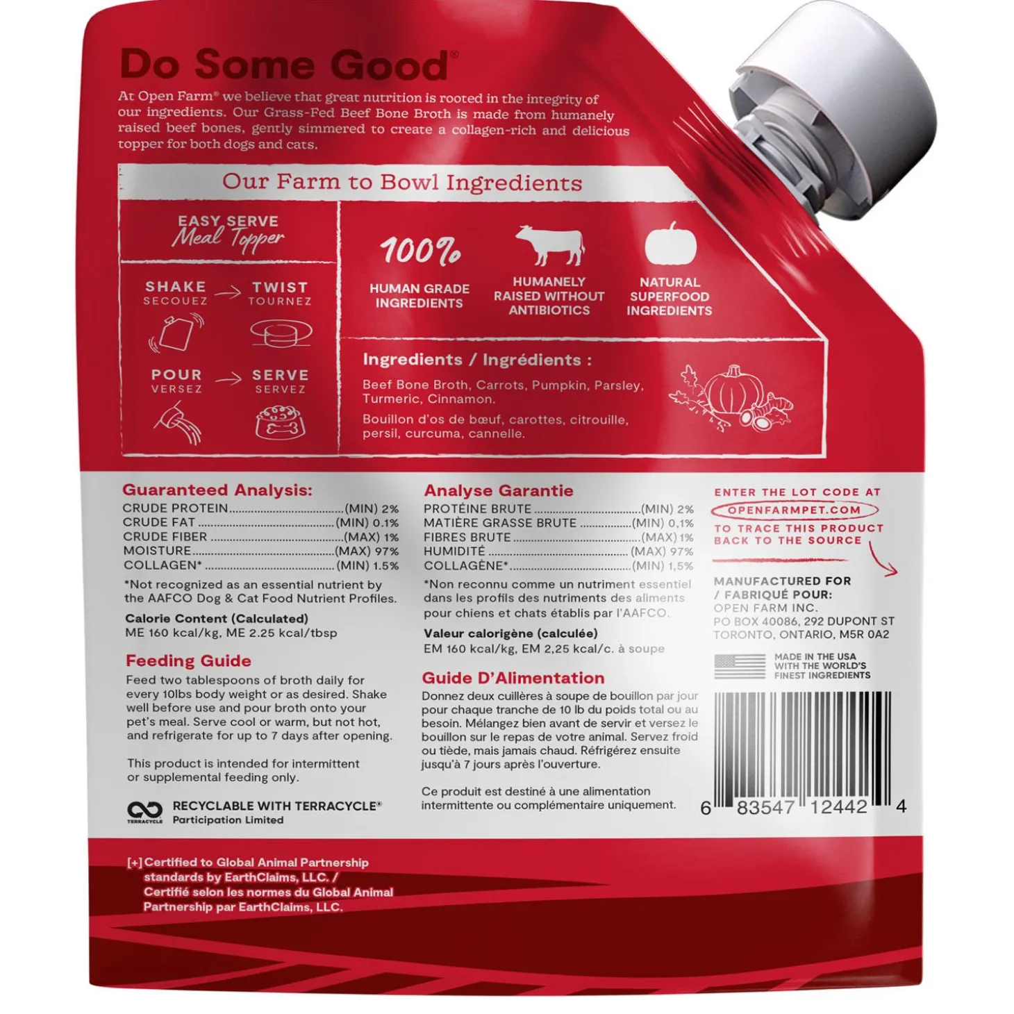 Open Farm Grass-Fed Beef Bone Broth Dog & Cat Meal Topper is known to be a superfood, super-soup or super delicious. Whatever you call it, our new broth comes from ethically raised grass-fed beef. The bones are slowly simmered with functional ingredients like locally sourced non-GMO pumpkins and carrots, and superfoods like turmeric. And it’s made specifically for pets free of antibiotics, growth hormones, salt, garlic, and onion. Serve as a topper for dry food or to rehydrate our Freeze Dried Raw recipes.
