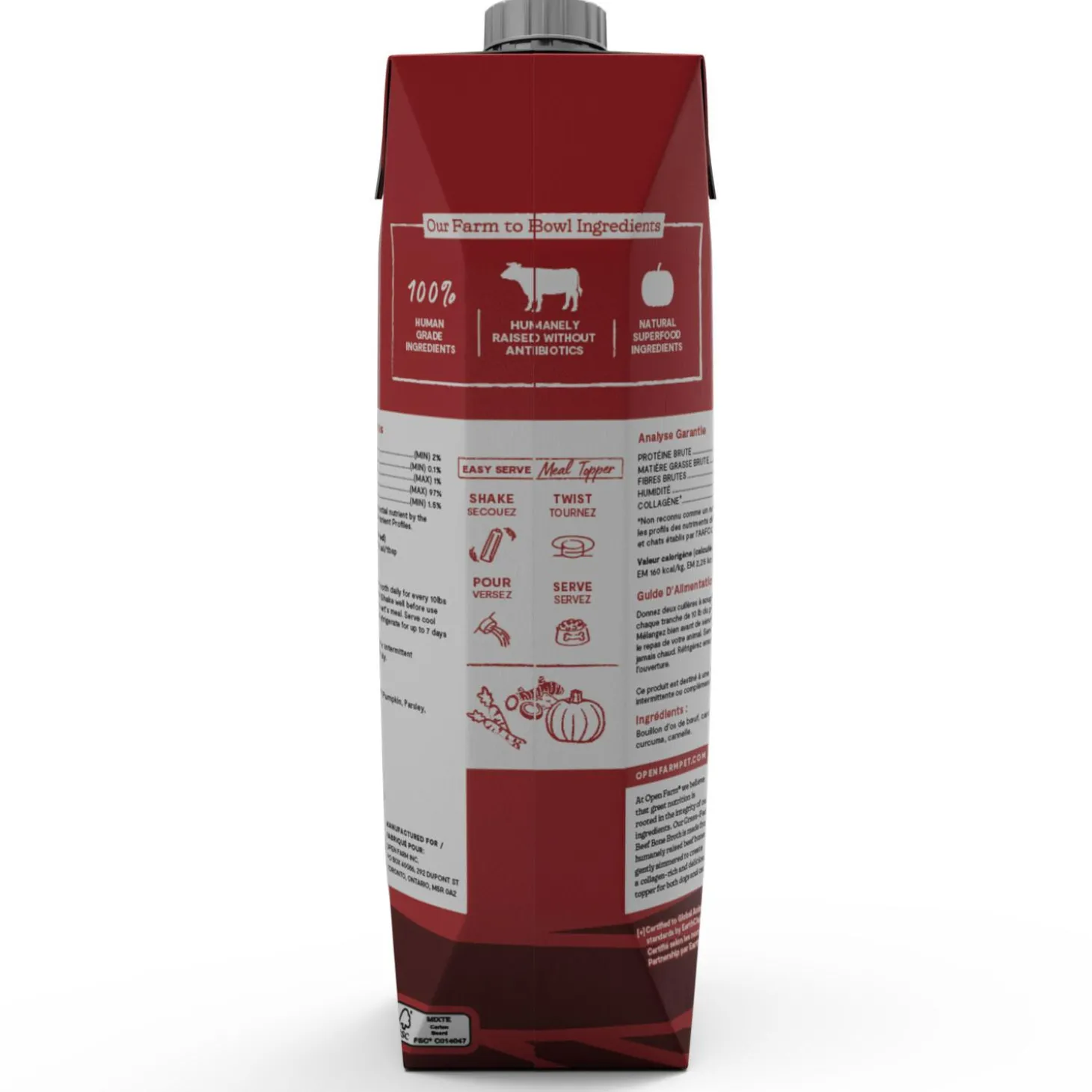 Open Farm Grass-Fed Beef Bone Broth Dog & Cat Meal Topper is known to be a superfood, super-soup or super delicious. Whatever you call it, our new broth comes from ethically raised grass-fed beef. The bones are slowly simmered with functional ingredients like locally sourced non-GMO pumpkins and carrots, and superfoods like turmeric. And it’s made specifically for pets free of antibiotics, growth hormones, salt, garlic, and onion. Serve as a topper for dry food or to rehydrate our Freeze Dried Raw recipes.