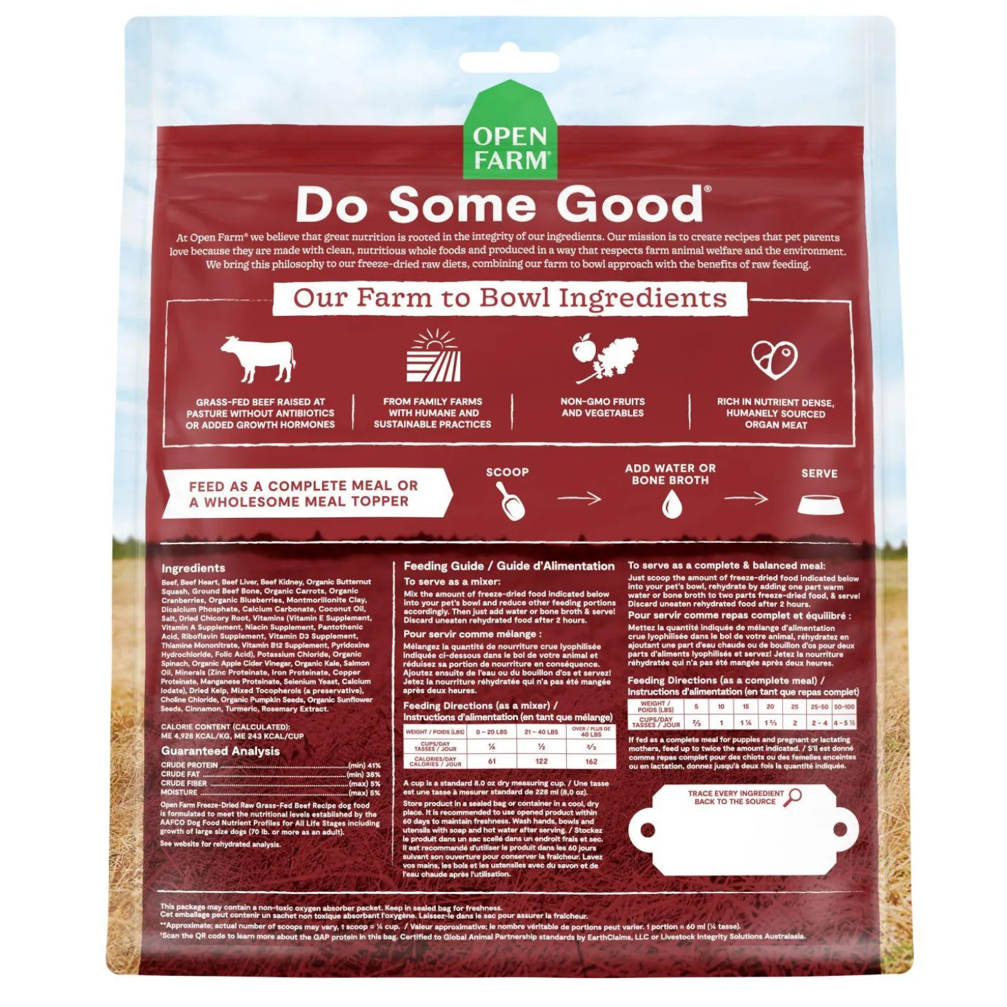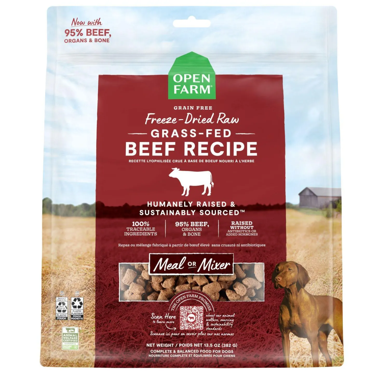Open Farm Grass-Fed Beef Recipe Freeze Dried Raw Dog Food is easy to serve and easy to please. This high protein topper or complete meal is packed with humanely raised 100% grass-fed beef. For added nutrition we include functional ingredients like locally sourced leafy greens, squash and pumpkin seeds, superfoods like coconut oil, and antioxidants like blueberries.