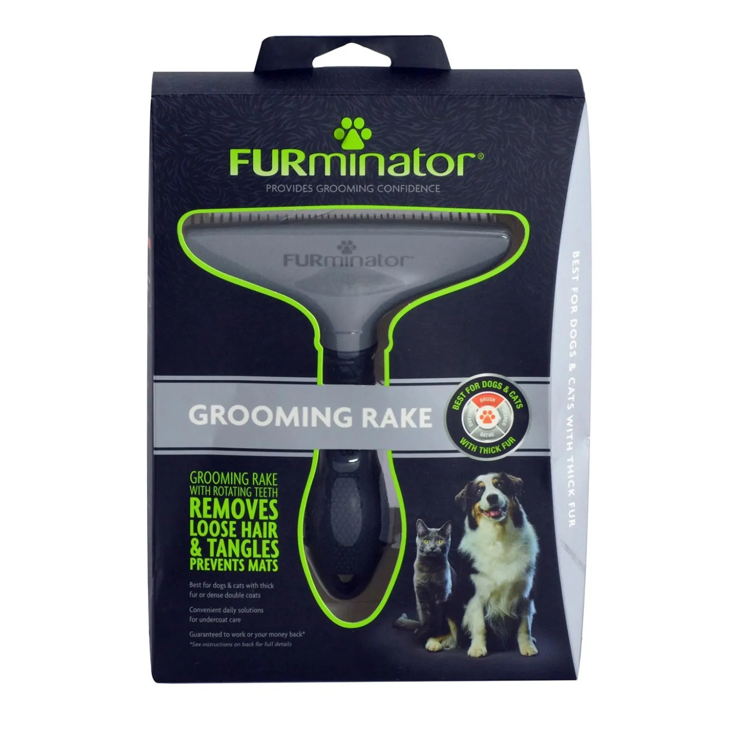 FURminator Grooming Rake allows you to take your grooming routine into your own hands by implementing the FURminator Ultimate Hair Reduction System: Brush, Deshed, Bathe and Maintain for grooming confidence in the comfort of your own home. The Deshedding tools, grooming tools and hair solutions offer a grooming regimen catered to any dog or cat. The FURminator Grooming Rake has rotating metal teeth that remove loose hair from your pet’s undercoat. Best for dogs and cats with thicker fur, the FURminator Grooming Rake helps prevent tangles and mats. The ergonomic nonslip handle gives you maximum control. Routine maintenance is important to keeping up with your pet and home. The FURminator Grooming Rake provides a convenient daily solution for undercoat care.