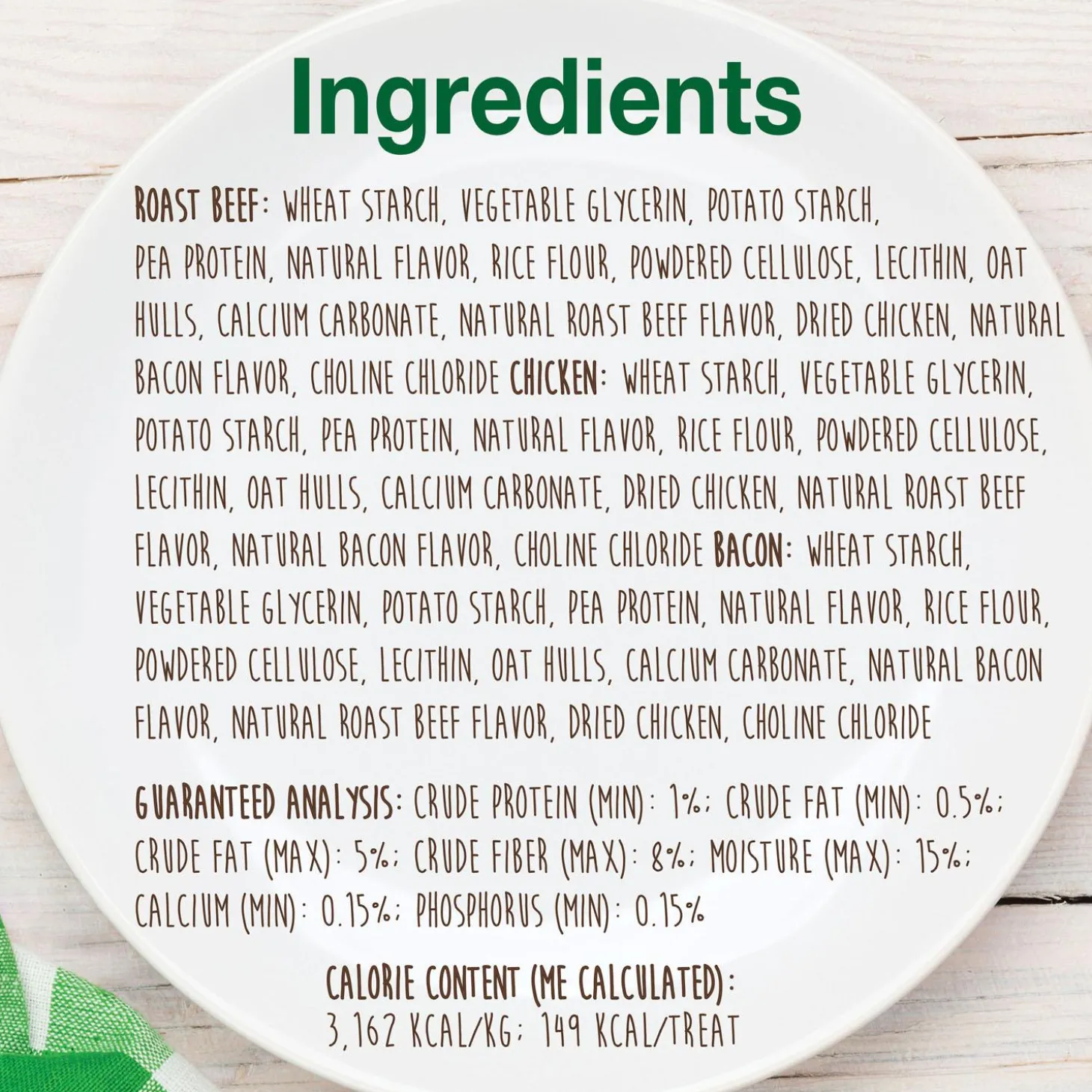 - Features delicious chicken, bacon, and roast beef flavours dogs love