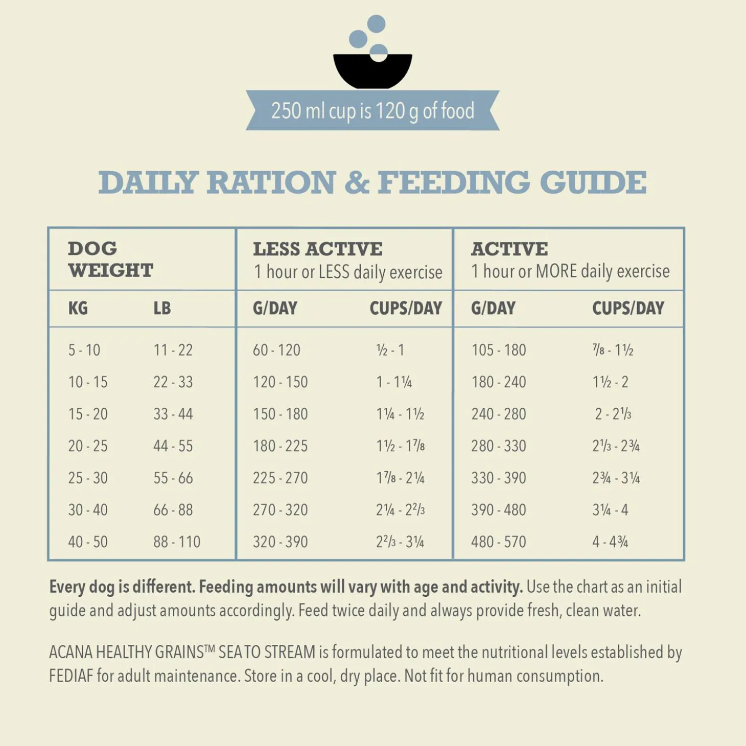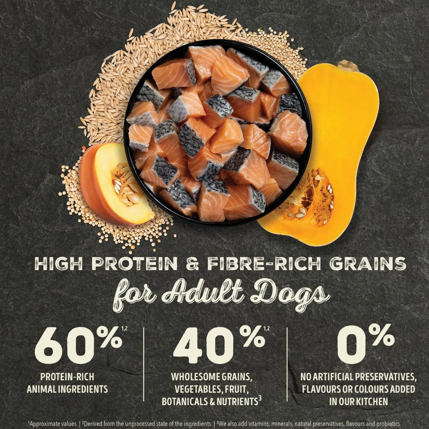 ACANA Healthy Grains Sea to Stream Recipe Adult Dog Food is rich with protein from fish and specially crafted with a blend of raw salmon, herring and trout. Its also balanced with healthy grains in the form of oats, sorghum and millet. These grains are high in fibre and gluten-free, offering added nutrition that helps support a healthy digestive environment. This Sea to Stream Recipe is crafted with 60% protein-rich fish ingredients* balanced with 40% wholesome grains, vegetables, fruit, botanicals and nutrients** and helps support 4 key health benefits. The result is a protein-rich, nutritious and delicious food to help your dog live a full, happy life.