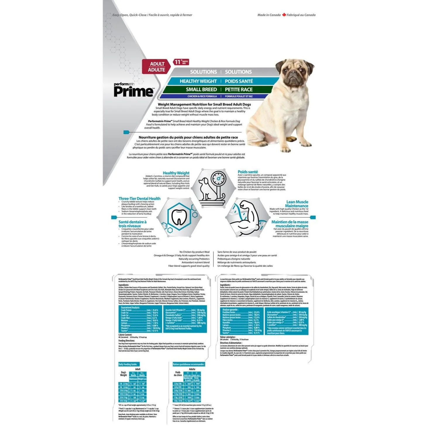 Performatrin Prime Healthy Weight Chicken & Rice Formula Small Breed Adult Dog Food is designed to meet the specific needs of small breed adult dogs where the goal is to help achieve and maintain your dog’s ideal weight and support overall health. Dogs have specific daily energy and nutrient requirements. This is especially true for small breed adult dogs where the goal is to maintain a healthy body condition or reduce weight without muscle mass loss. This food is formulated to help achieve and maintain your dog’s ideal weight and support overall health.