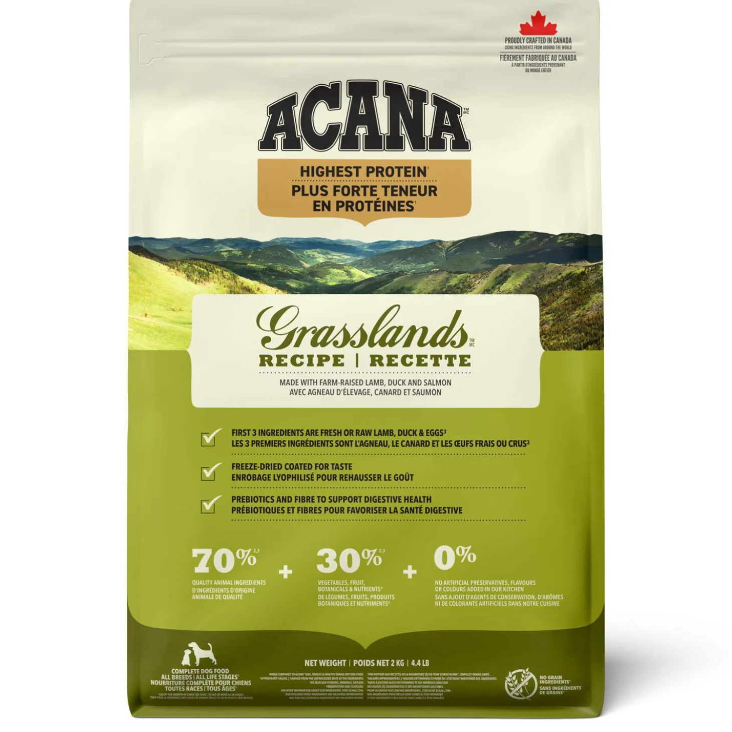 ACANA Highest Protein Grasslands Recipe Dog Food is perfect for satisfying your dog with even more of the animal protein they crave. The Grasslands Recipe is crafted with 70% quality animal ingredients* like farm-raised lamb, duck, eggs, and freshwater lake fish balanced with 30%** fruit and vegetables to help nurture your dog with flavour and animal protein. It also includes prebiotics and fibre to help support your dogs digestive health. And with no artificial colours, flavours or preservatives added in the kitchen, its a recipe you and your dog will both love. Nurture your dog with a protein-rich, nutritious, and delicious dog food to help them live a healthy, happy life.