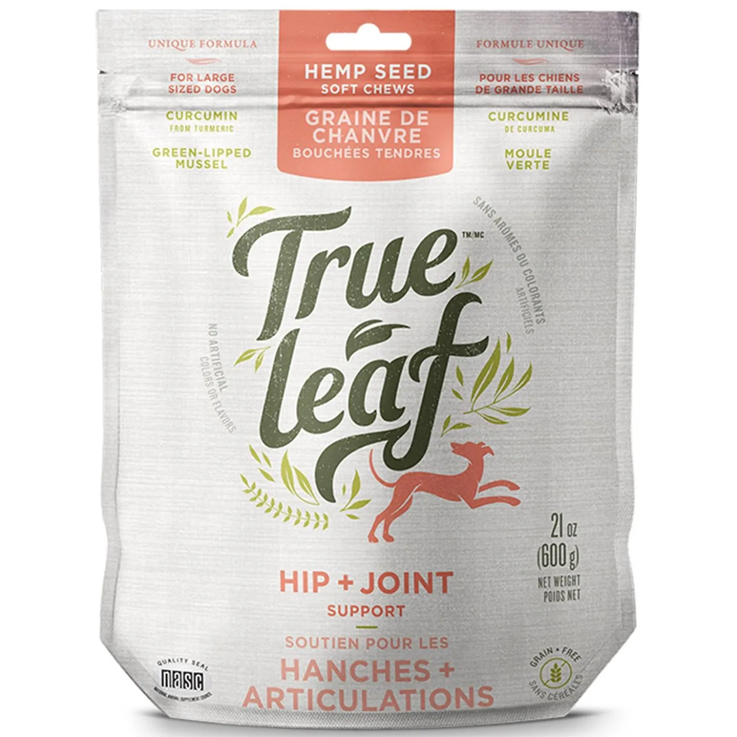 True Leaf Hip + Joint Support Chews Large Dog Supplements contain a balanced combination of omega fatty acids (3, 6 and 9) that support the formation and function of normal joint tissue. This combination comes from fresh, Canadian-grown, high quality hemp seed oil and high-fat green lipped mussels from New Zealand. Green lipped mussels are used as a rich source of Chondroitin, Glucosamine, EPA, DHA and rare ‘ETA’, known to improve joint function. In addition, True Leaf added turmeric powder that contains 95% curcuminoids, which is traditionally used in Ayurvedic medicine as an antioxidant and to support joint health. These chews were formulated with veterinary oversight to provide your pet with the optimal blend of ingredients that are not only as ‘natural’ as possible but also backed with scientific research to support normal joint function and contribute to your pet’s active lifestyle.